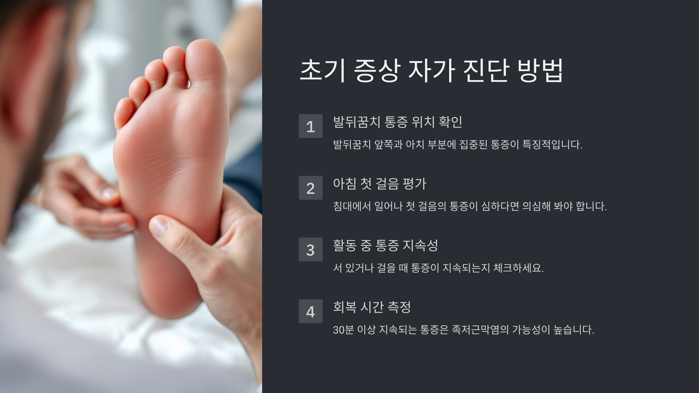 | 발뒤꿈치 눌렀을 때 통증 | 통증 위치가 명확하면 염증 부위 특정 가능 |