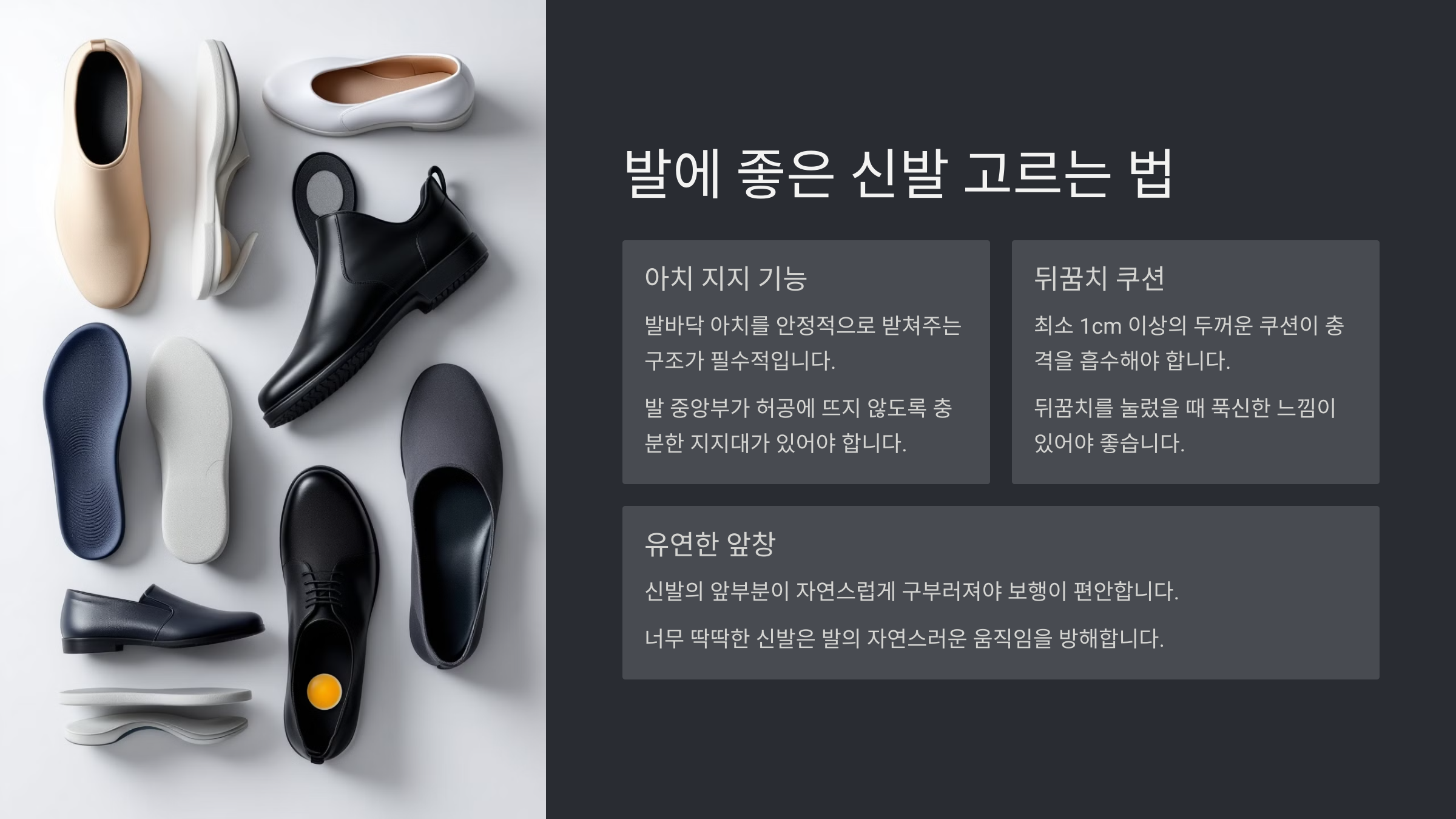 신발을 고를 땐 단순히 디자인이 아니라 내 발 형태와 라이프스타일을 고려하는 게 중요해요. 예를 들어 장시간 서 있는 직업이라면 좀 더 아웃솔이 두껍고 탄력 있는 신발이 필요해요.