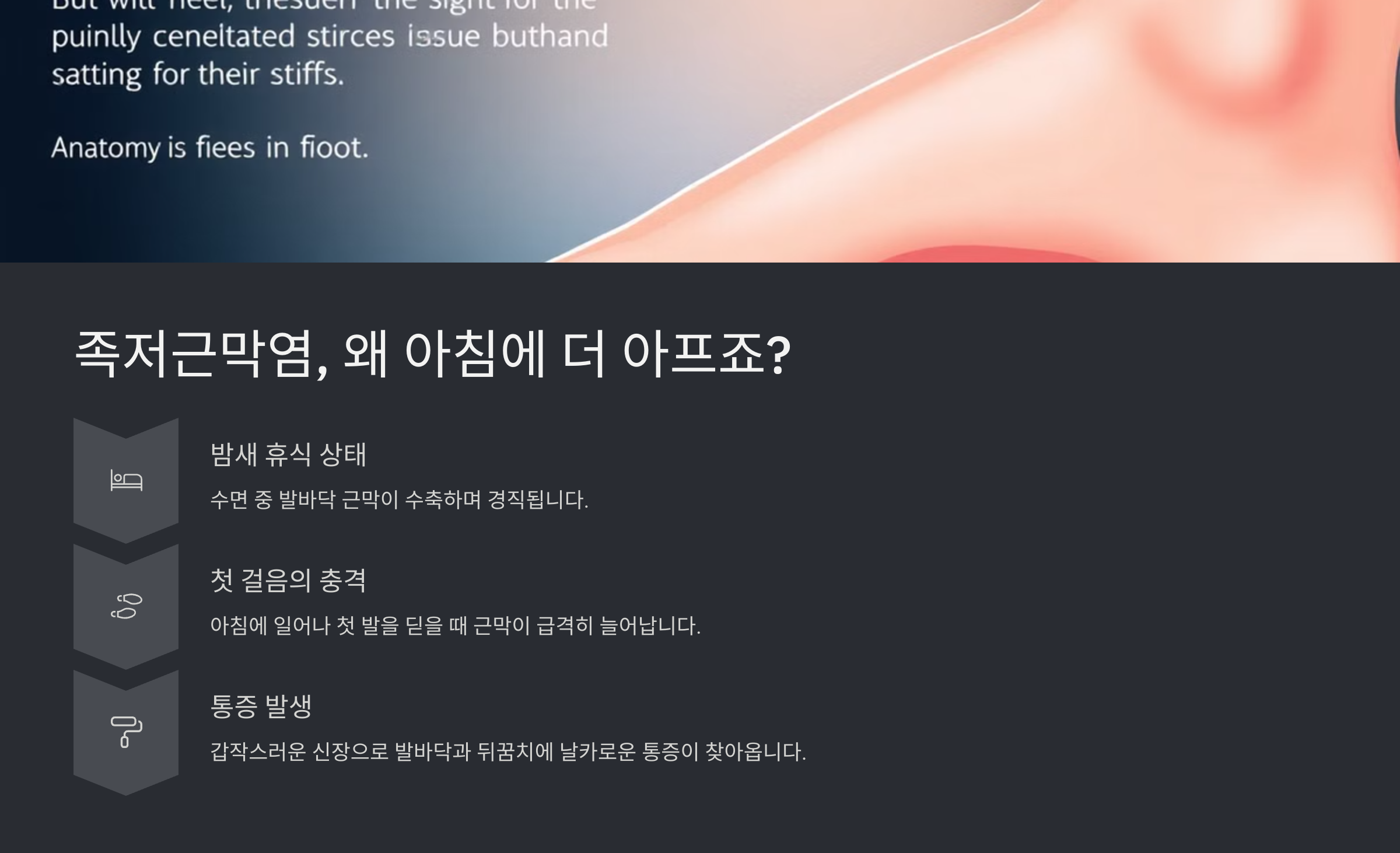 1️⃣ 아침에 일어나 첫 걸음에 발뒤꿈치 또는 발바닥 중앙에 찌릿한 통증이 느껴진다.
