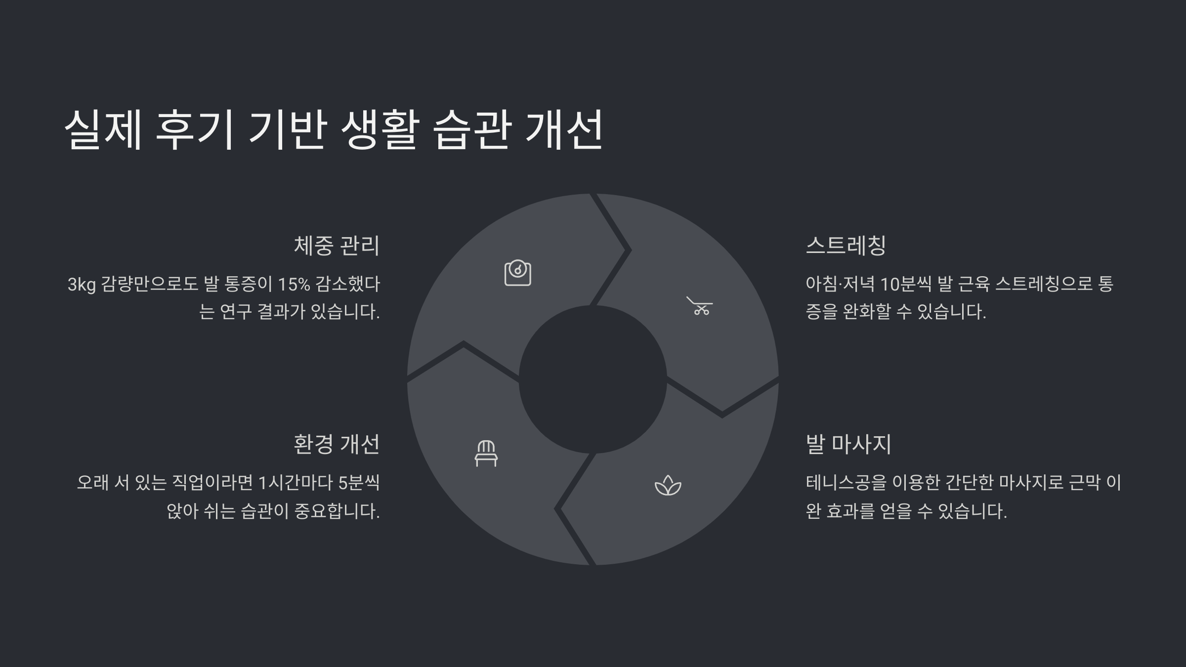 한 직장인은 아침마다 5분 스트레칭을 하고, 실내에서도 발에 맞는 실내화를 신는 습관을 들인 후 통증이 절반 이상 줄었다고 해요. 그 외에도 오래 앉아 있던 자리에서 일어날 때 먼저 발목을 천천히 돌린 뒤 걸음을 시작하는 습관도 효과적이었다고 하더라고요.