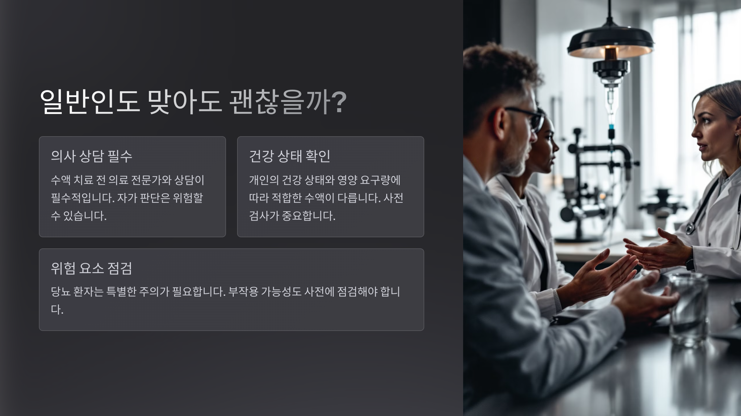 의학적으로 건강한 일반인도 맞는 데 큰 문제는 없어요. 하지만 중요한 건 ‘내 몸에 필요하지 않은 영양소를 억지로 넣는 건 아닌지’를 체크하는 거예요. 특히 신장 기능이 약하거나 특정 영양소에 과민한 사람은 주의가 필요해요.