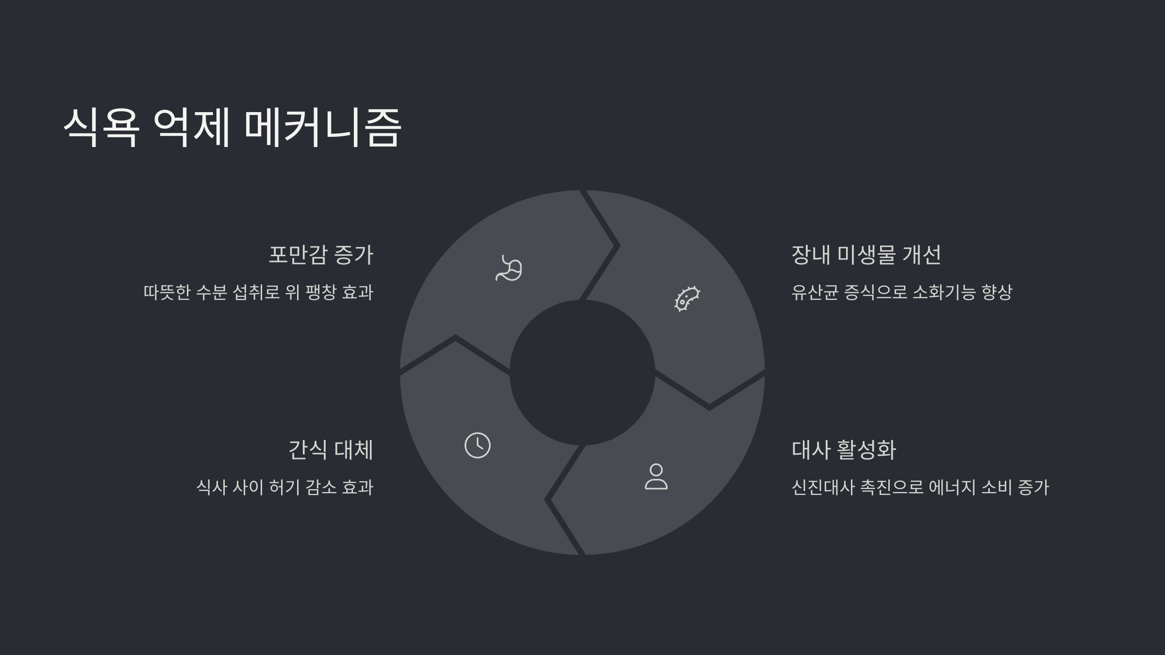 | 스트레스 | 코르티솔 증가로 단 음식 욕구 상승 | 간접적 억제 가능 |