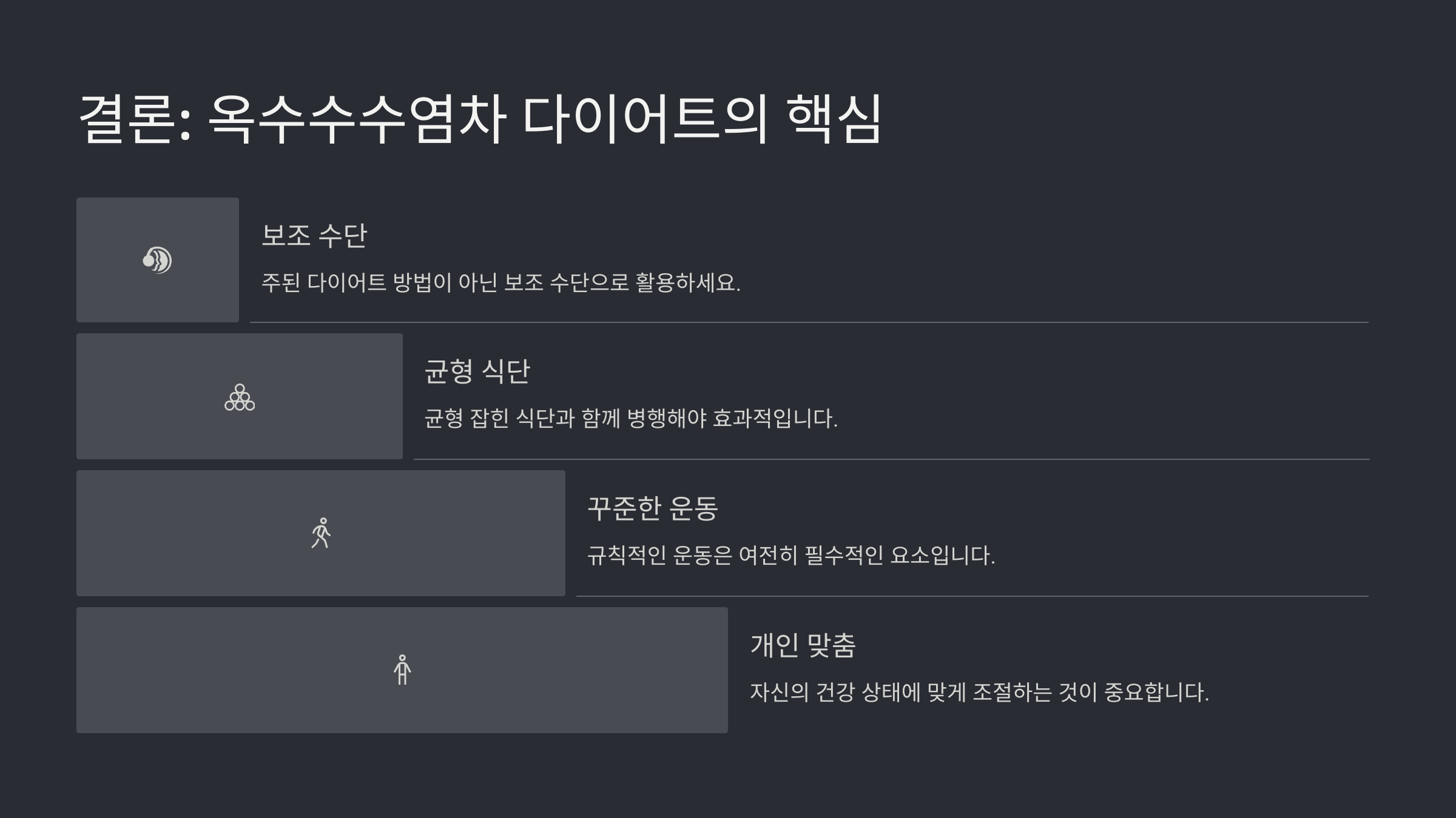 다이어트는 결국 '꾸준함'과 '균형'이 중요하니까요. 옥수수수염차는 단기 효과를 기대하기보단, 일상 속 루틴으로 편입해서 식단과 조화롭게 활용해야 진짜 효과가 생겨요. 무조건 금식이나 절식을 하려 하기보다, 똑똑하게 식습관을 관리하는 데 이 차가 '작은 무기'가 될 수 있죠! 🔥