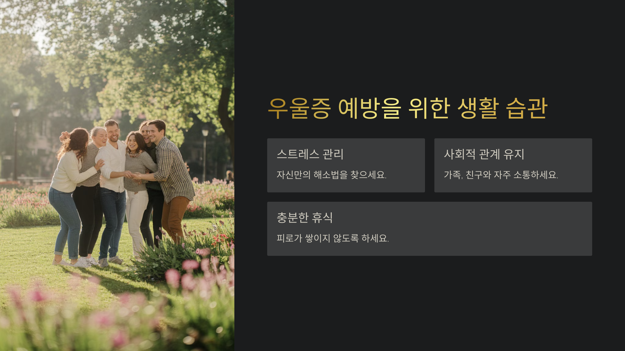 ✅ 스트레스 관리하기 스트레스가 쌓이면 우울증 위험도 높아져요. 명상, 독서, 음악 감상, 취미 생활을 통해 스트레스를 해소하는 것이 좋아요.