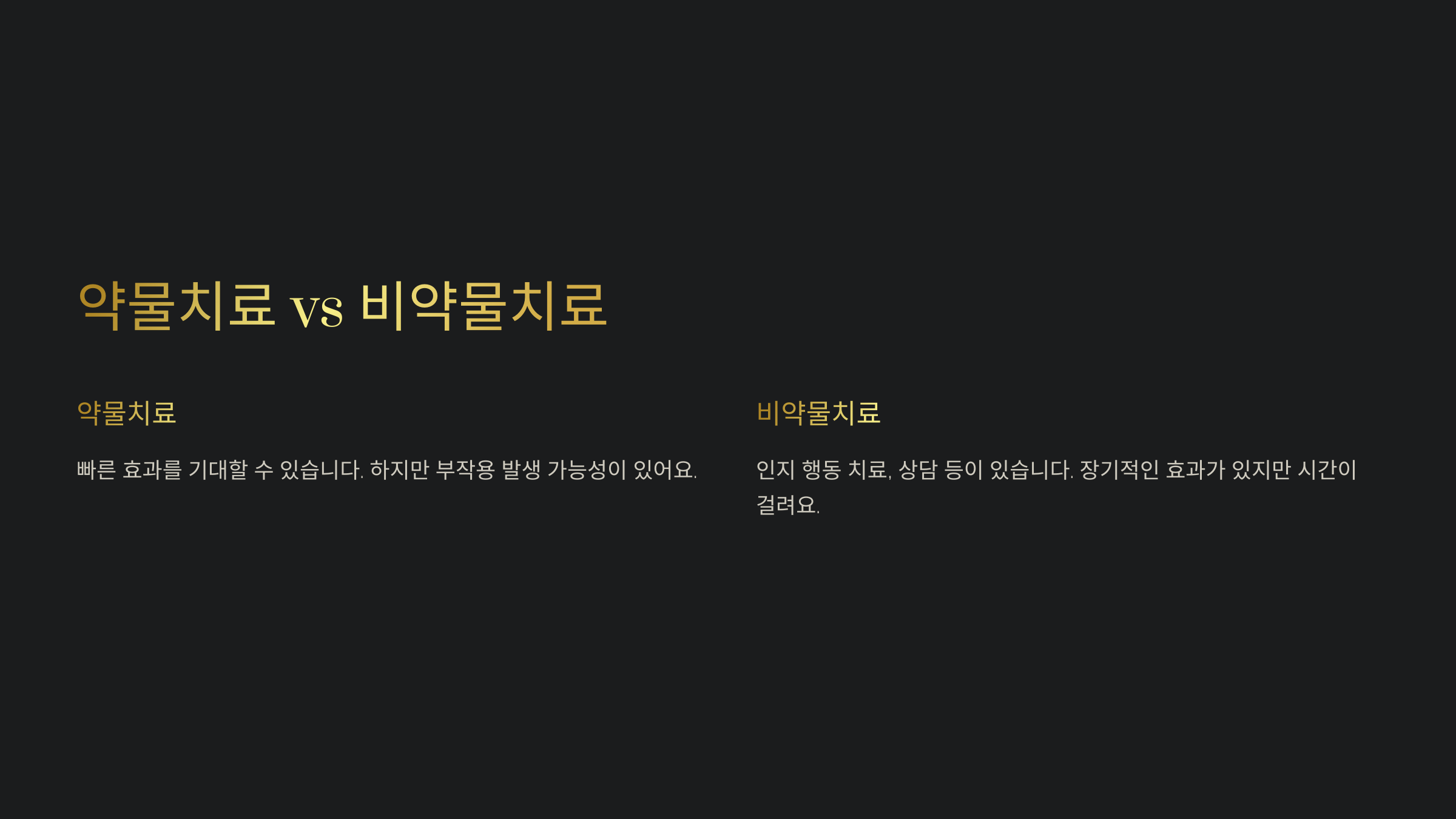| 약물치료 | 빠른 효과, 중증 우울증 치료 가능 | 부작용 가능성, 장기 복용 필요 |