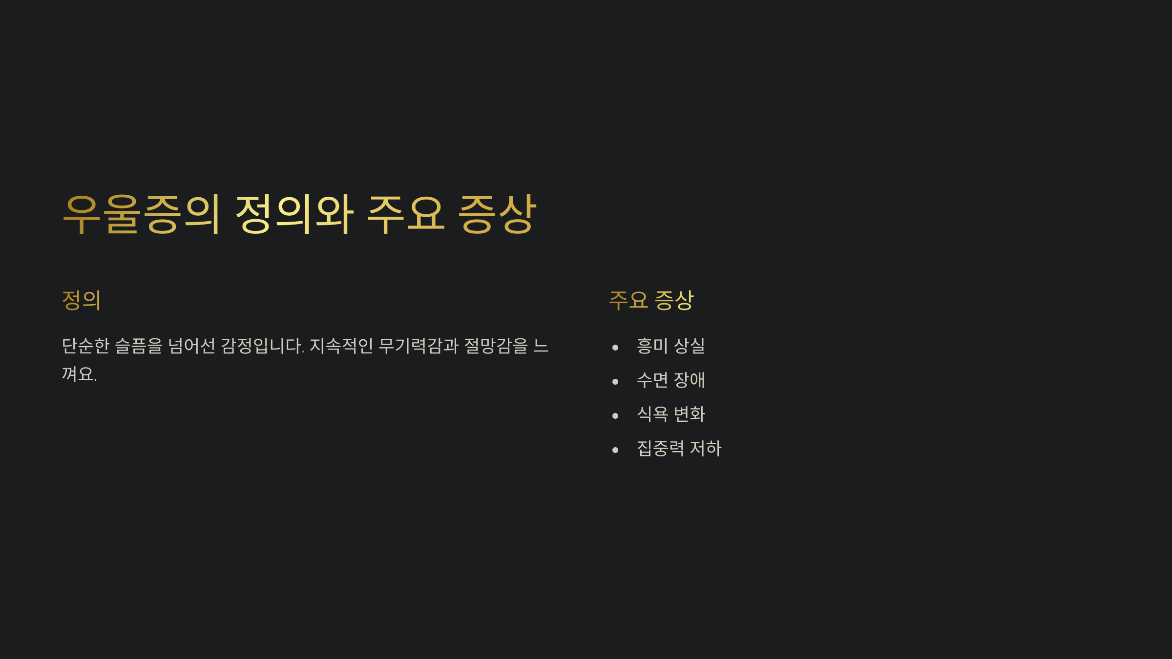 우울증(Depression)은 감정 장애의 일종으로, 지속적인 슬픔과 흥미 상실을 특징으로 해요. 단순한 우울한 기분과는 다르게, 장기간 지속되며 삶의 질을 크게 저하시킬 수 있어요.
