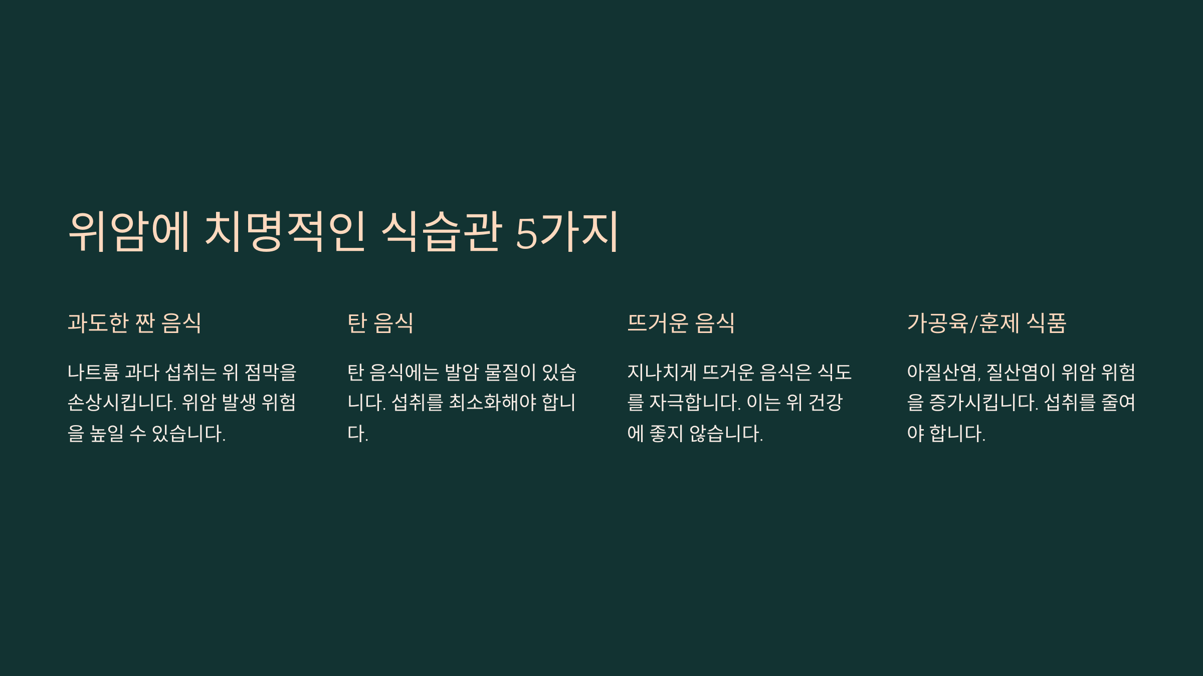 1. 짜게 먹는 습관 - 짠 음식은 위 점막을 자극하고 손상시켜요. 김치, 젓갈, 장아찌 같은 음식은 위암의 주요 위험 요인 중 하나예요.