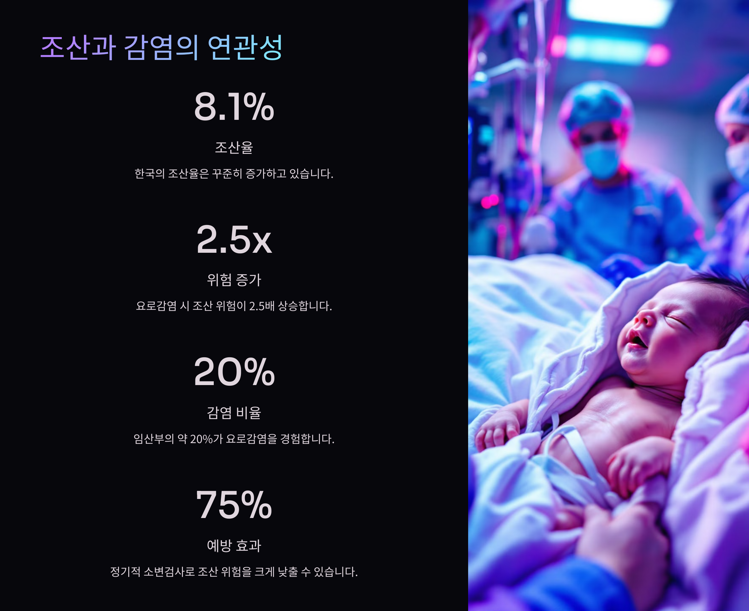 조산과 관련된 감염 중 가장 위험한 건 자궁내 감염(intrauterine infection)이에요. 이 경우 양막이 약해져 조기파열로 이어질 수 있고, 양수가 오염되면 태아의 건강에도 직접적인 영향을 줄 수 있답니다.