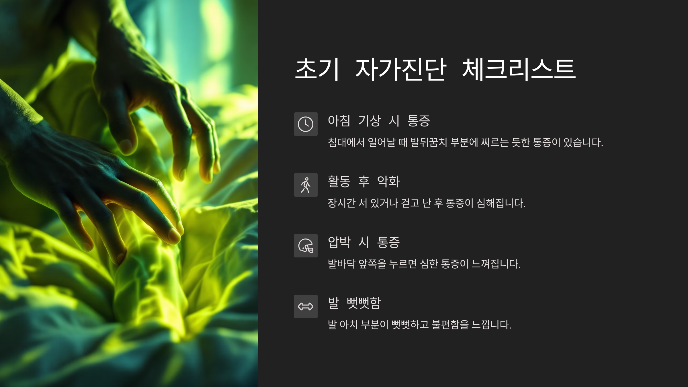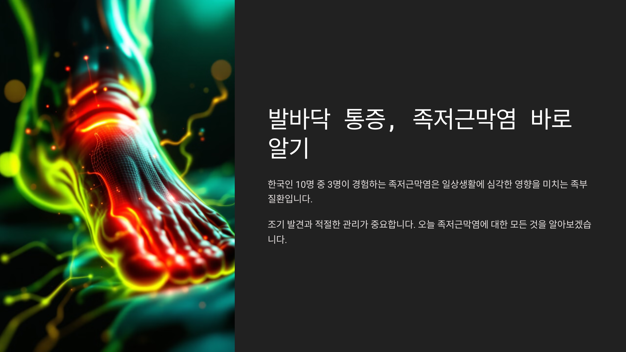 많은 분들이 단순한 통증으로 여기고 방치하지만, 치료 시기를 놓치면 만성화되기 쉬운 질환이 바로 족저근막염이에요. 그래서 조기 자가진단과 관리가 정말 중요하답니다. 지금부터 족저근막염에 대해 꼭 알아야 할 모든 것을 정리해볼게요.