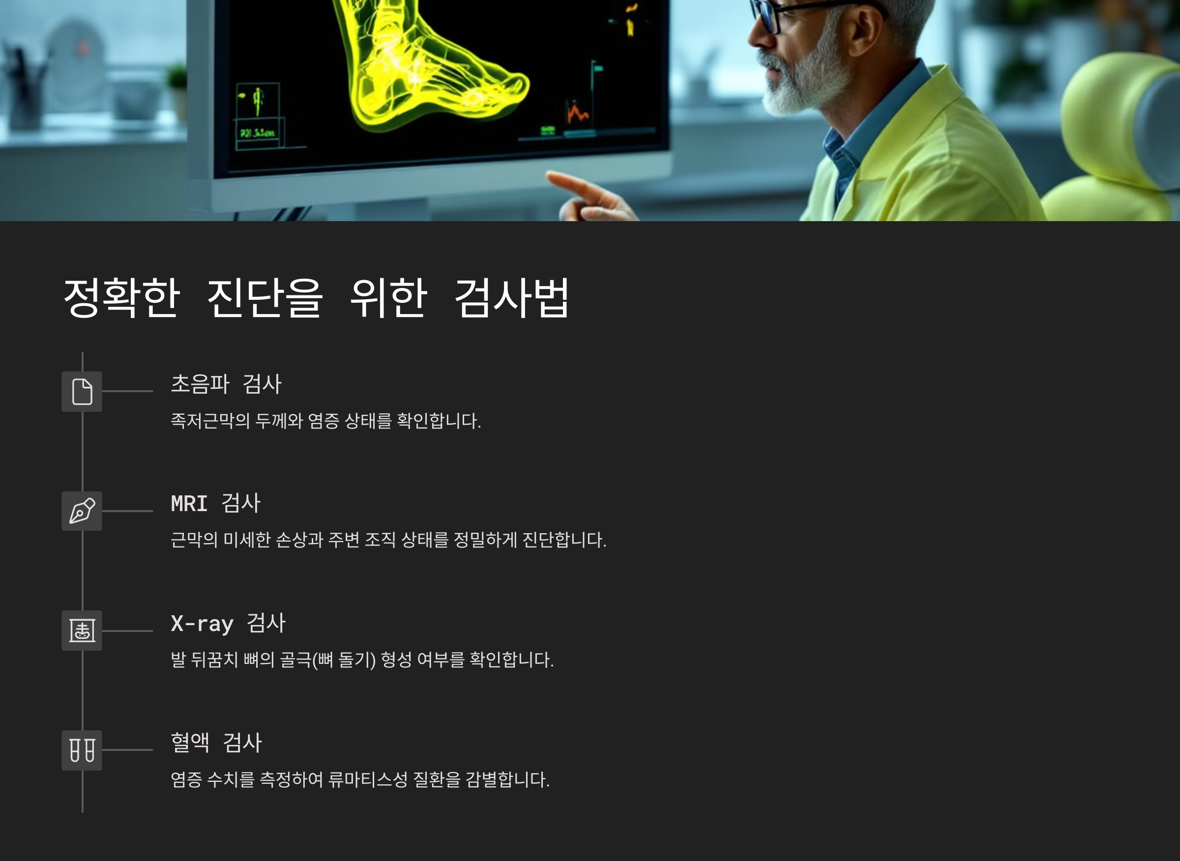 보다 정밀한 진단을 원한다면 초음파 검사 또는 MRI가 활용돼요. 특히 초음파 검사는 족저근막의 두께를 실시간으로 확인할 수 있어서, 염증 상태나 파열 여부를 정확히 볼 수 있어요. 검사 시간도 짧고, 방사선 노출도 없어서 안전하답니다.