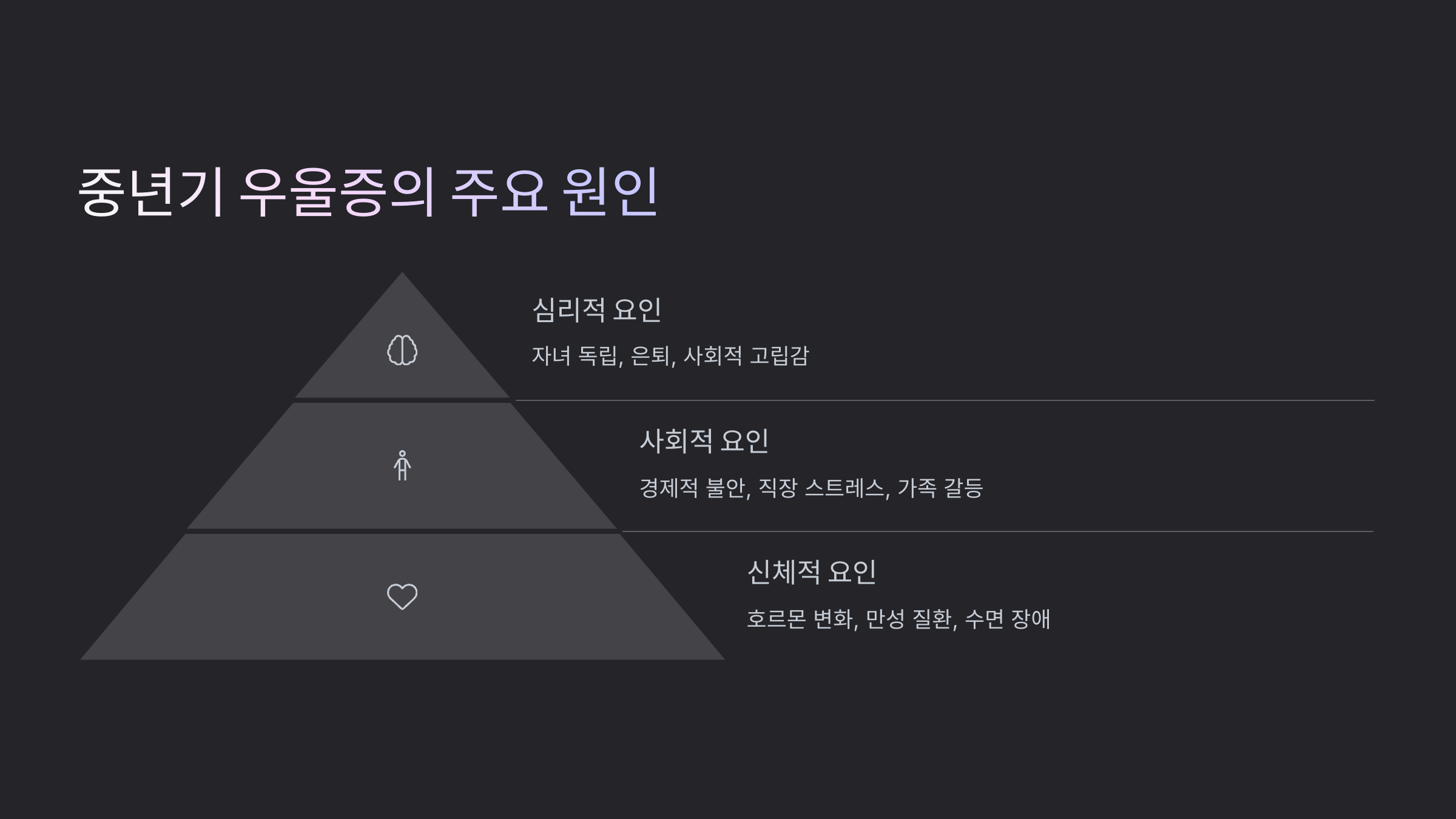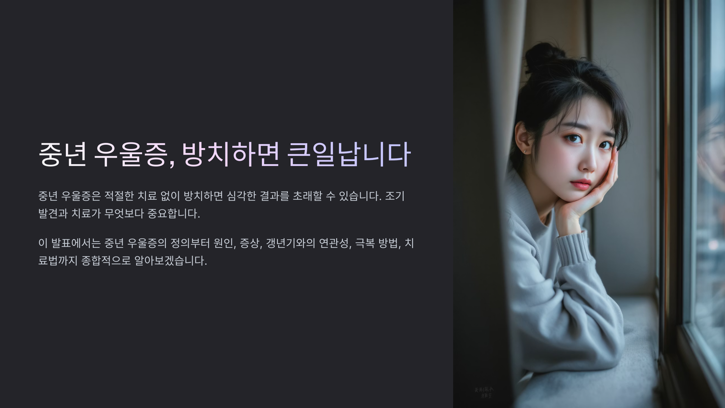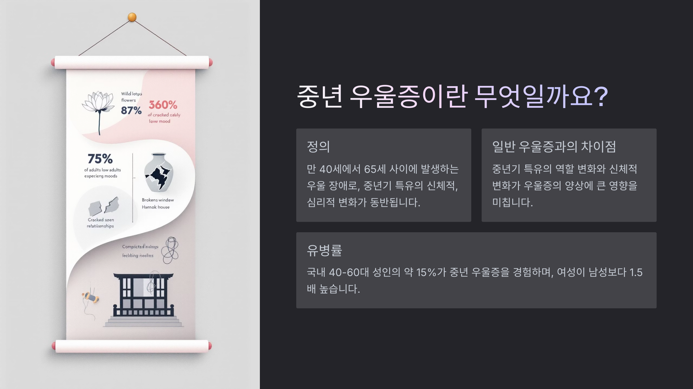 중년이라는 시기는 인생의 전환점이에요. 자녀의 독립, 직장 내 변화, 노화로 인한 신체적 변화 등 여러 가지 심리적 충격이 한꺼번에 몰려오면서 마음이 쉽게 흔들릴 수 있죠. 특히나 그 과정에서 우울증이라는 그림자가 조용히 스며들기도 해요.