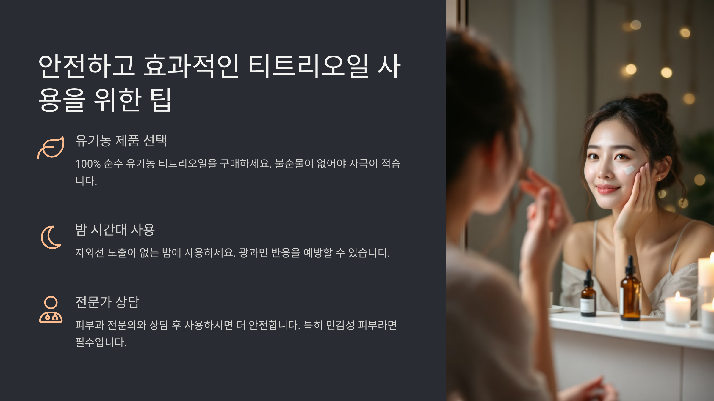 티트리오일은 피부 진정에 탁월하지만, 잘못 사용하면 오히려 자극이 될 수도 있어요. 그래서 최대한 부드럽고 안전하게 사용하는 노하우를 알면 훨씬 효과적으로 트러블을 관리할 수 있답니다. 특히 민감하거나 트러블이 자주 나는 분들에게 이 팁들이 큰 도움이 될 거예요. 😉