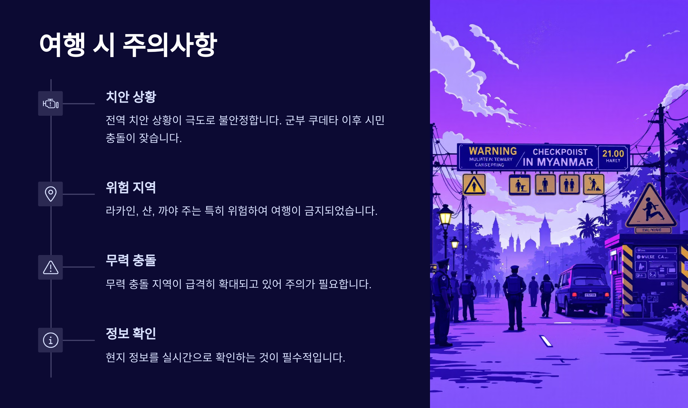 미얀마는 매력적인 여행지지만 현실적으로 다양한 문제가 존재하기도 해요. 특히 2021년 군부 쿠데타 이후 사회 전반이 불안정해지면서, 여행자 입장에서 반드시 유의해야 할 부분이 많아졌어요. 단순히 관광지를 둘러보는 것 이상으로 안전과 생활환경에 대한 준비가 필요한 곳이기도 해요.