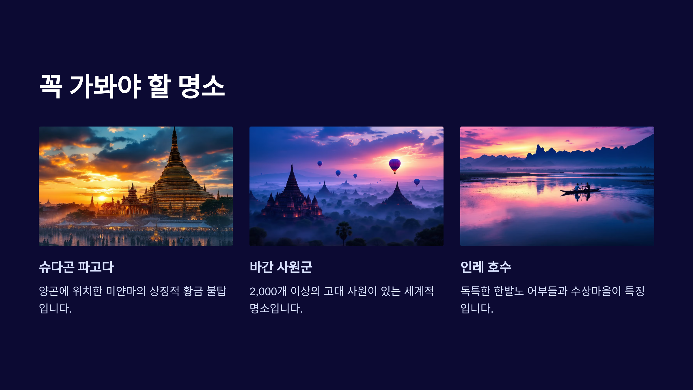 미얀마는 자연과 역사가 조화를 이루는 신비로운 여행지가 많아요. 불교 문화의 깊이가 느껴지는 사원부터, 이색적인 자연 풍경까지 다양하게 경험할 수 있는 장소가 많아서 어느 도시를 가든 놓치기 아까운 명소가 가득하답니다.