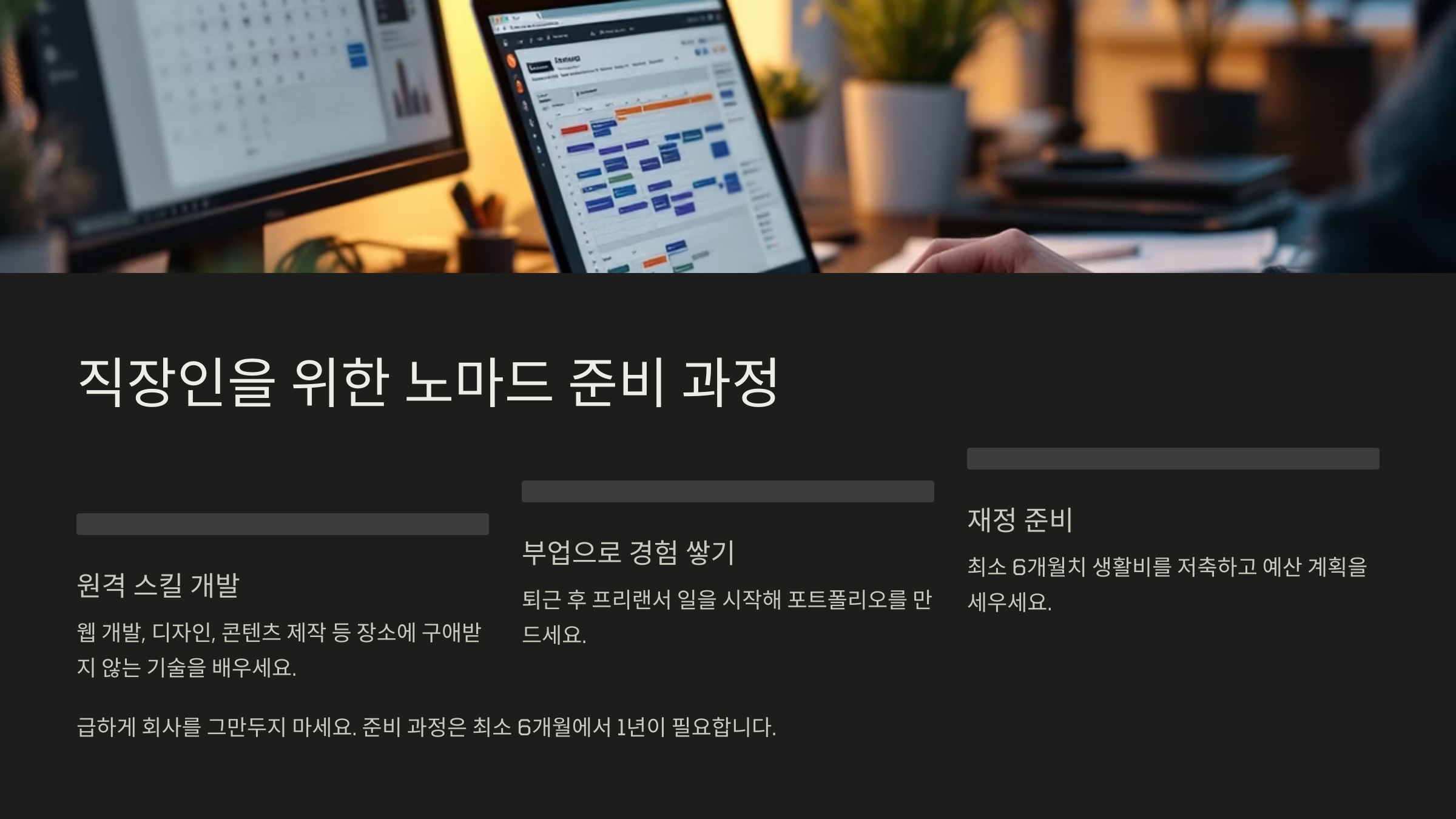 많은 사람들이 디지털 노마드가 되려면 회사를 그만두고 바로 여행을 떠나야 한다고 생각해요. 하지만 직장에 다니면서도 충분히 준비할 수 있어요! 오히려 급하게 퇴사하기보다는 미리 철저히 준비하는 게 더 안정적인 방법이에요. 😊