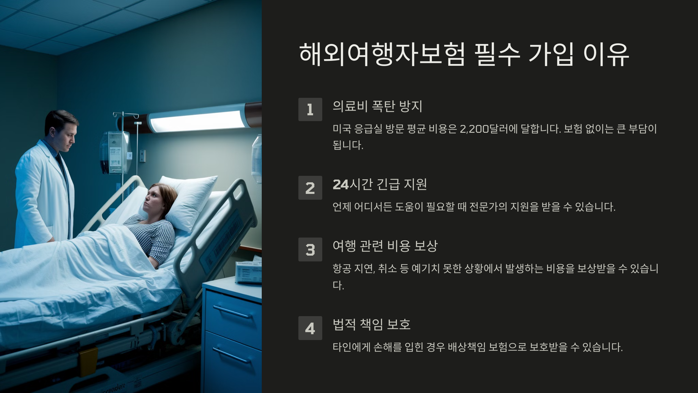 해외에서는 예측할 수 없는 사고가 언제든 발생할 수 있어요. 여행자보험은 이런 위험을 대비하는 필수 안전망이에요. 만약 보험 없이 해외에서 병원 신세를 지게 된다면? 수백만 원의 병원비가 나올 수도 있어요.