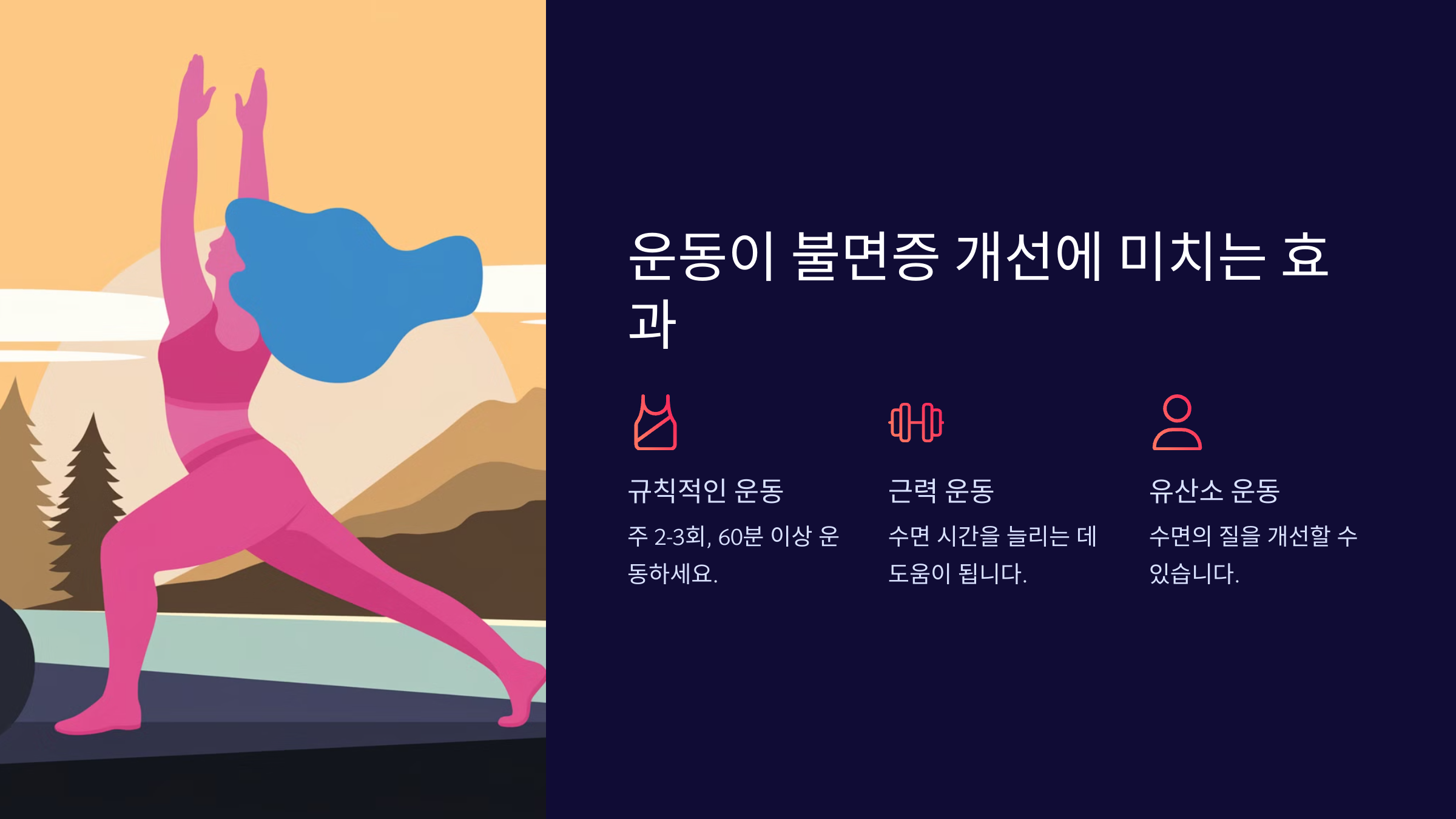 운동을 꾸준히 하면 수면의 질이 향상될 뿐만 아니라 전반적인 건강도 좋아져요. 불면증이 있다면 오늘부터라도 가벼운 운동을 시작해보는 게 어때요? 😊
