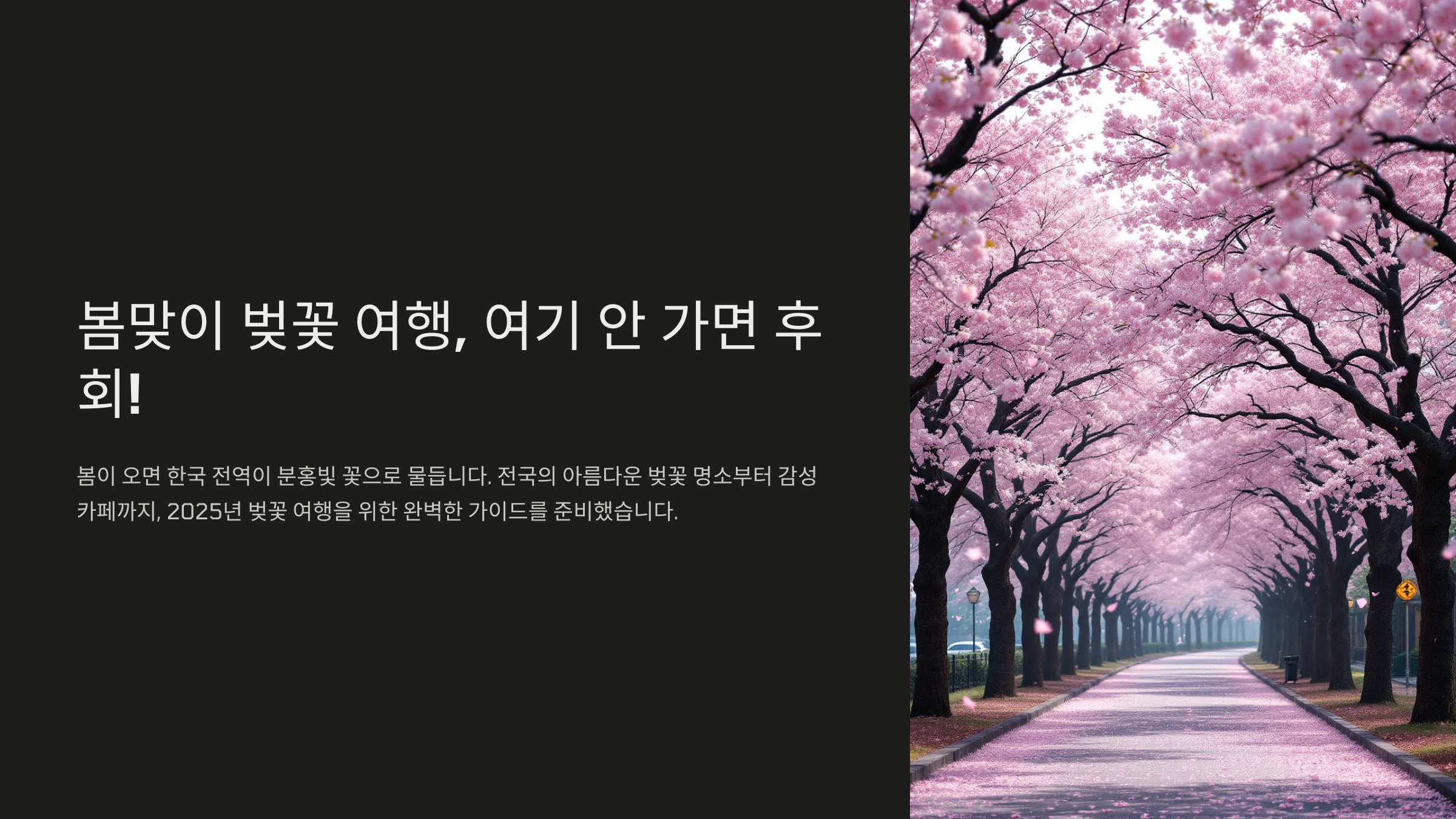 지금부터 벚꽃이 가장 아름다운 순간을 놓치지 않도록, 전국 벚꽃 명소와 여행 정보를 하나하나 살펴볼게요! 🌸🚗
