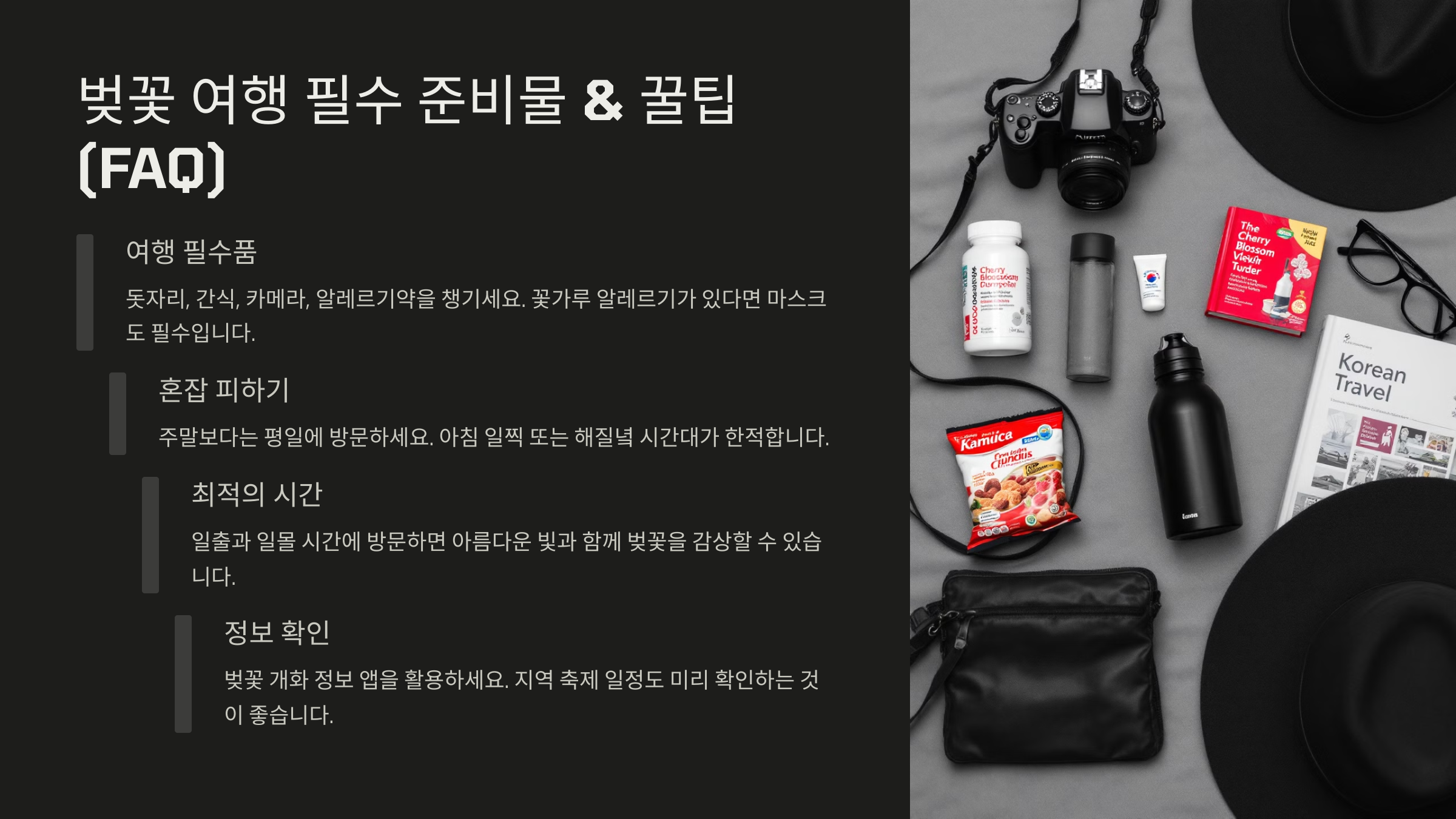 ⬇️ 마지막으로 벚꽃 여행 필수 준비물 & 꿀팁 (FAQ)를 확인해볼까요? 🎒🌸