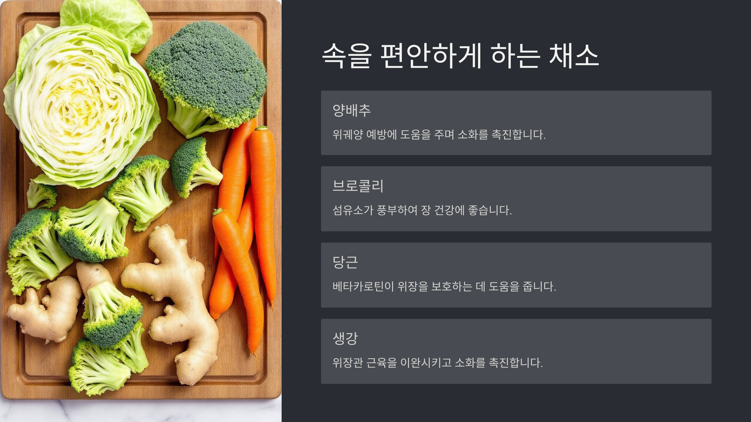 이 채소들은 속을 편안하게 하고 위 건강을 도와주는 역할을 해요. 특히 양배추는 위 보호 효과가 뛰어나서 꾸준히 섭취하면 좋아요! 🥬