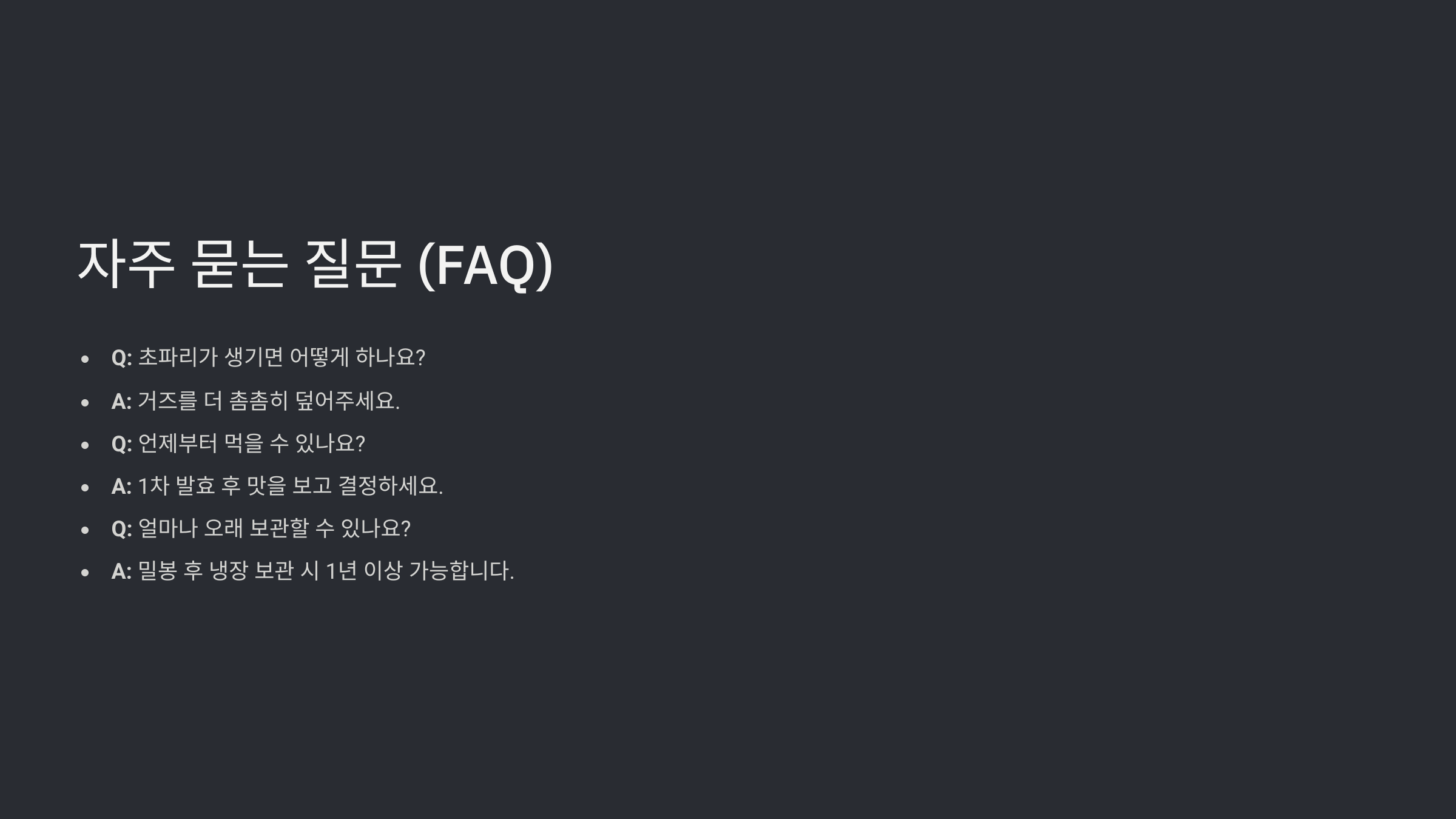 | 발효 안 됨 | 온도가 낮거나 설탕 부족 | 20~25°C 유지, 설탕 추가 |
