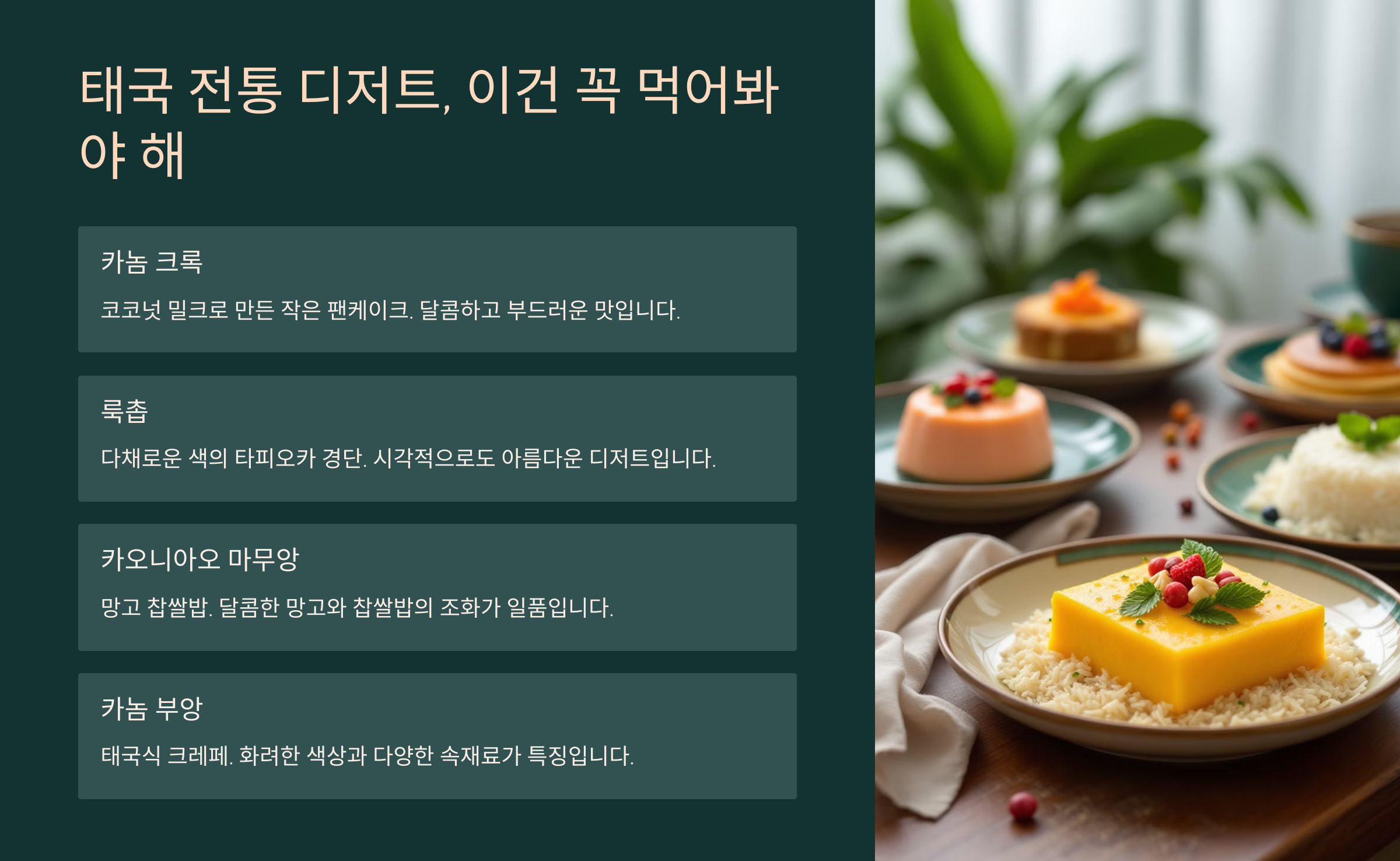 태국 디저트는 코코넛 밀크의 달콤한 맛과 쫀득한 식감이 매력적이에요. 🥭 여행 중에 꼭 한 번은 먹어보길 추천해요!
