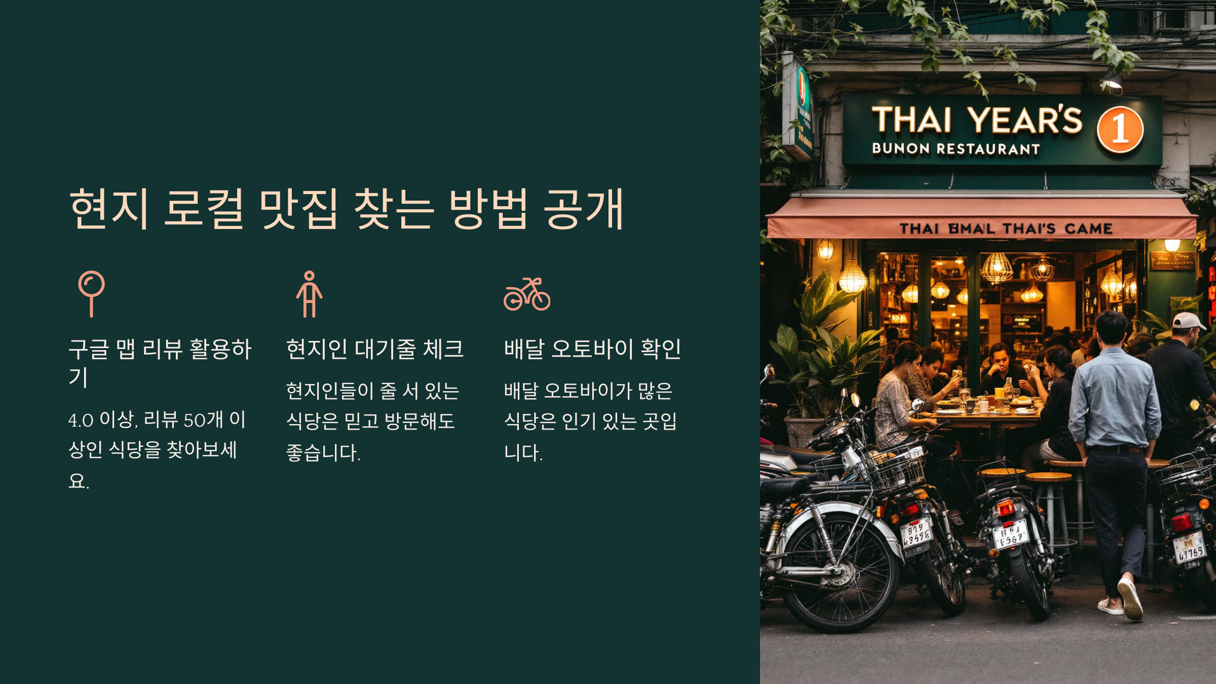 구글 지도에서 "local food near me" 또는 "태국 로컬 레스토랑"을 검색하면 평점이 높은 숨은 맛집들을 찾을 수 있어요. 트립어드바이저에서도 현지 여행자들이 남긴 후기들을 참고하면 실패 확률이 줄어들어요!