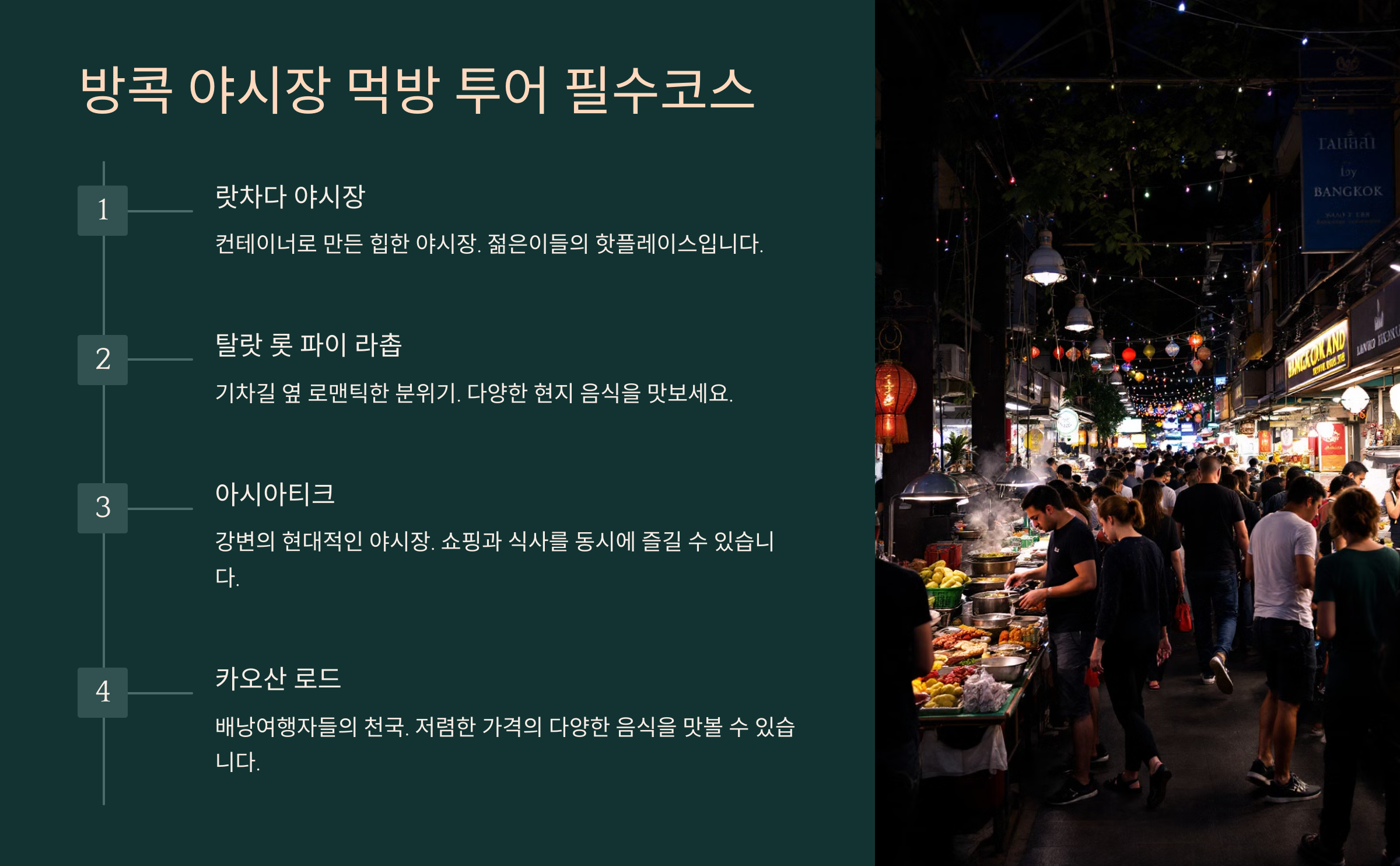 | 짜뚜짝 야시장 | 똠얌꿍, 꼬치구이 | 태국 최대 규모, 쇼핑 가능 |