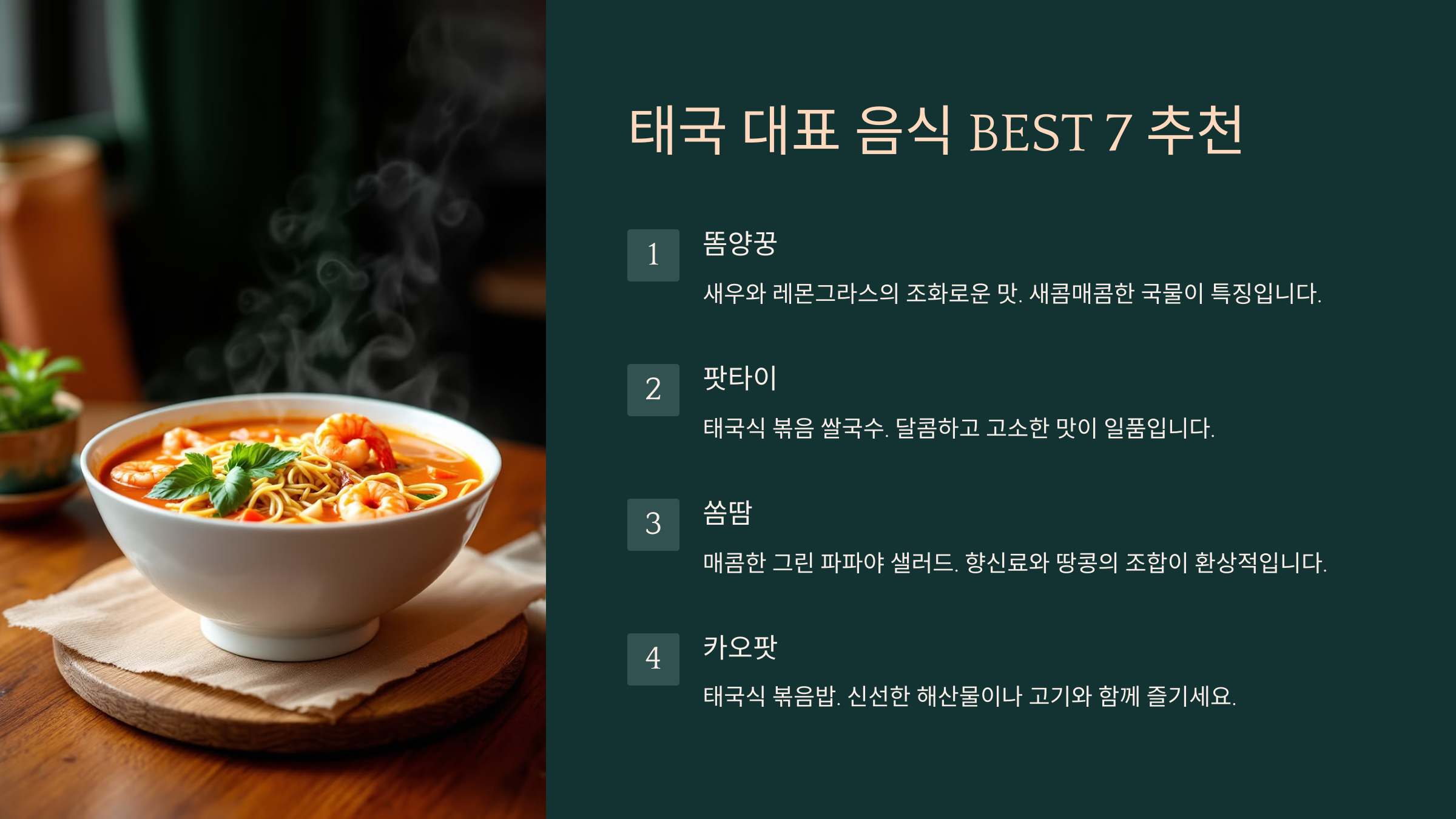 태국 음식은 맛도 다양하고, 가격도 저렴해서 여행하는 동안 질리지 않아요! 그중에서도 특히 많은 사람들이 찾는 대표 음식 7가지를 소개할게요.