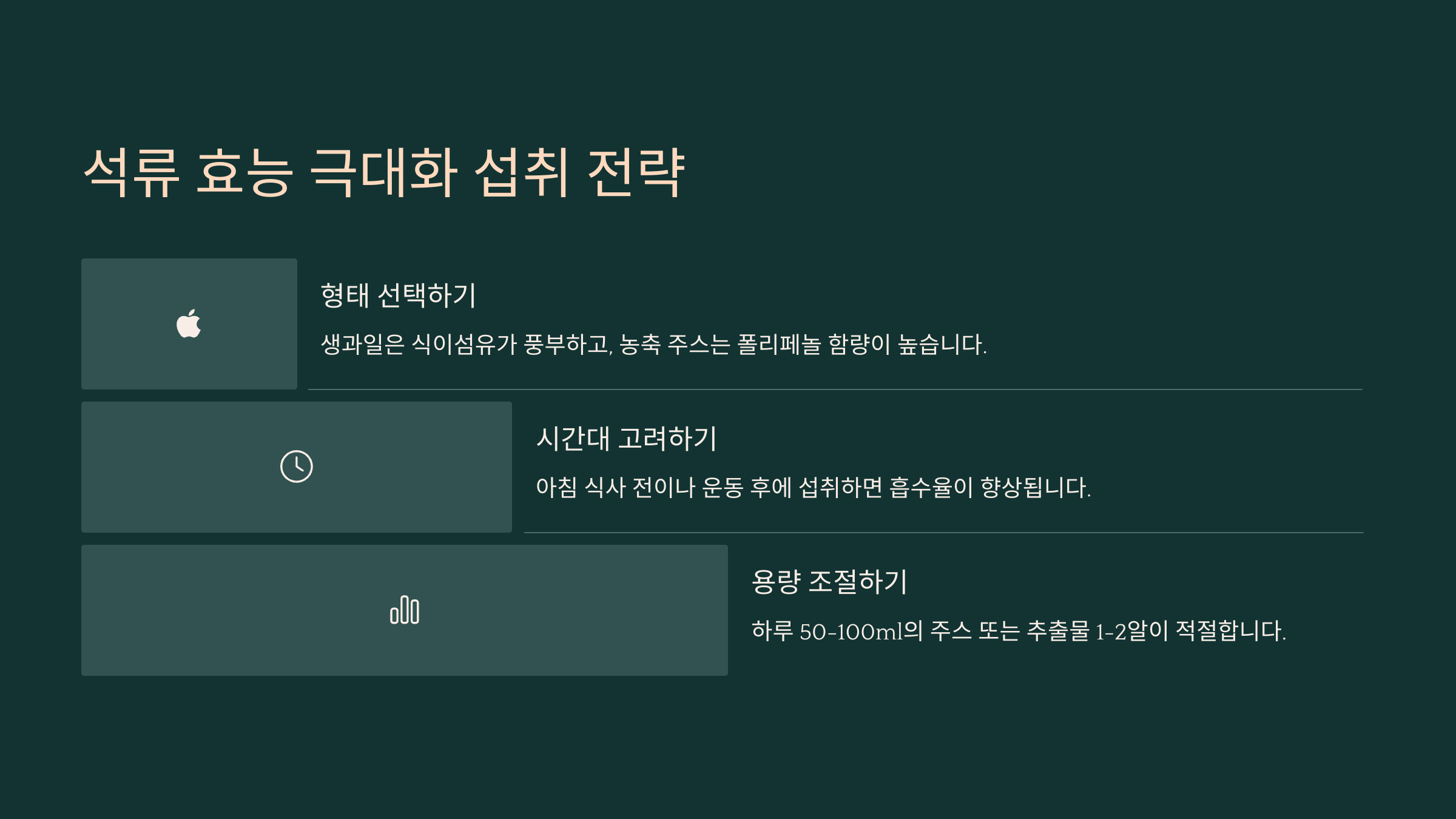 | 석류즙 | 즉각 섭취 가능, 흡수 빠름 | 산도 강해 위 부담 가능 | 전반적 섭취자 |
