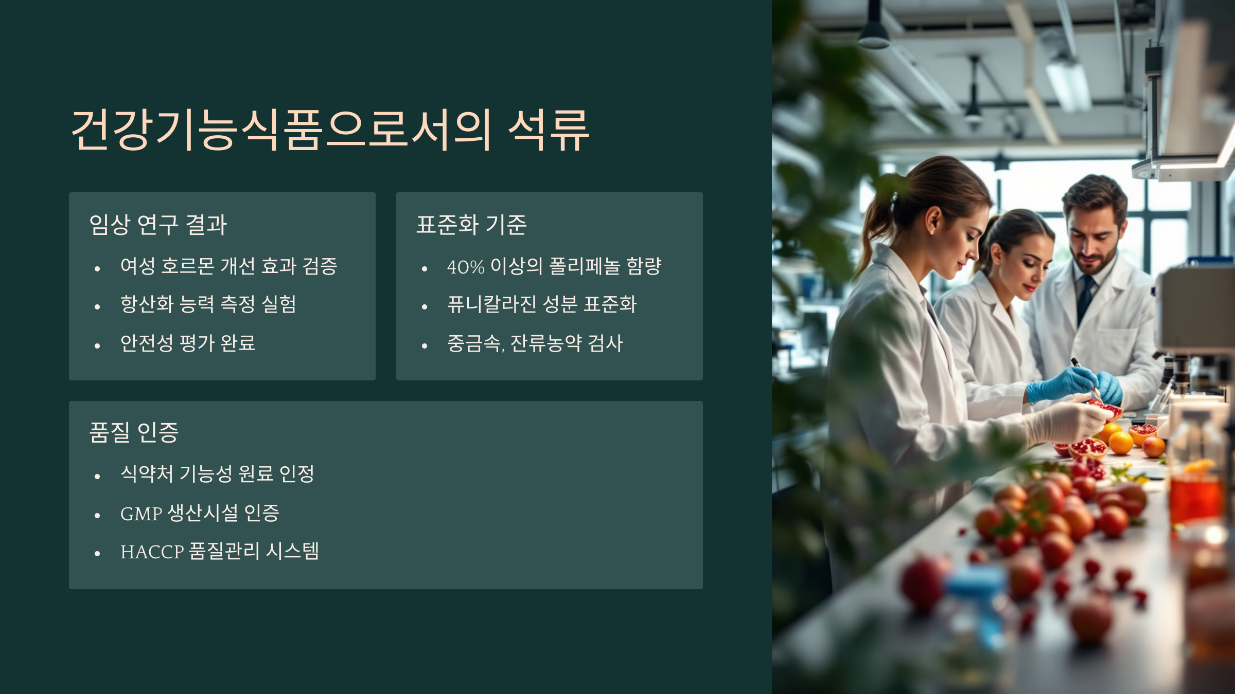 특히 갱년기 여성용으로 출시된 석류 제품들은 식물성 에스트로겐과 유사한 성분의 함량을 기준으로 설정해 제조되기 때문에, 기능성 목적에 더 적합한 경우가 많아요.