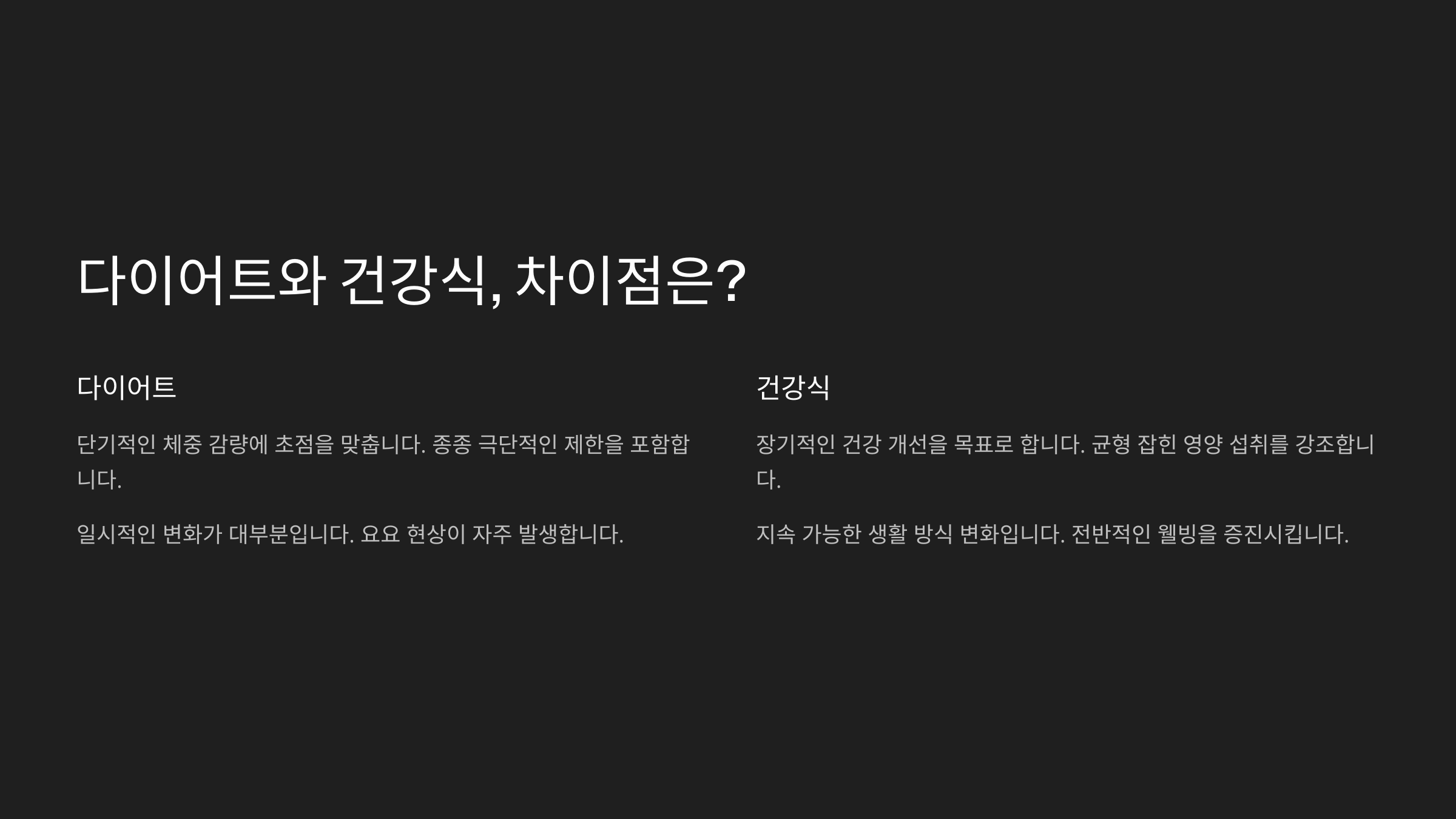 | 식단 지속성 | 일시적 | 장기적으로 유지 가능 |