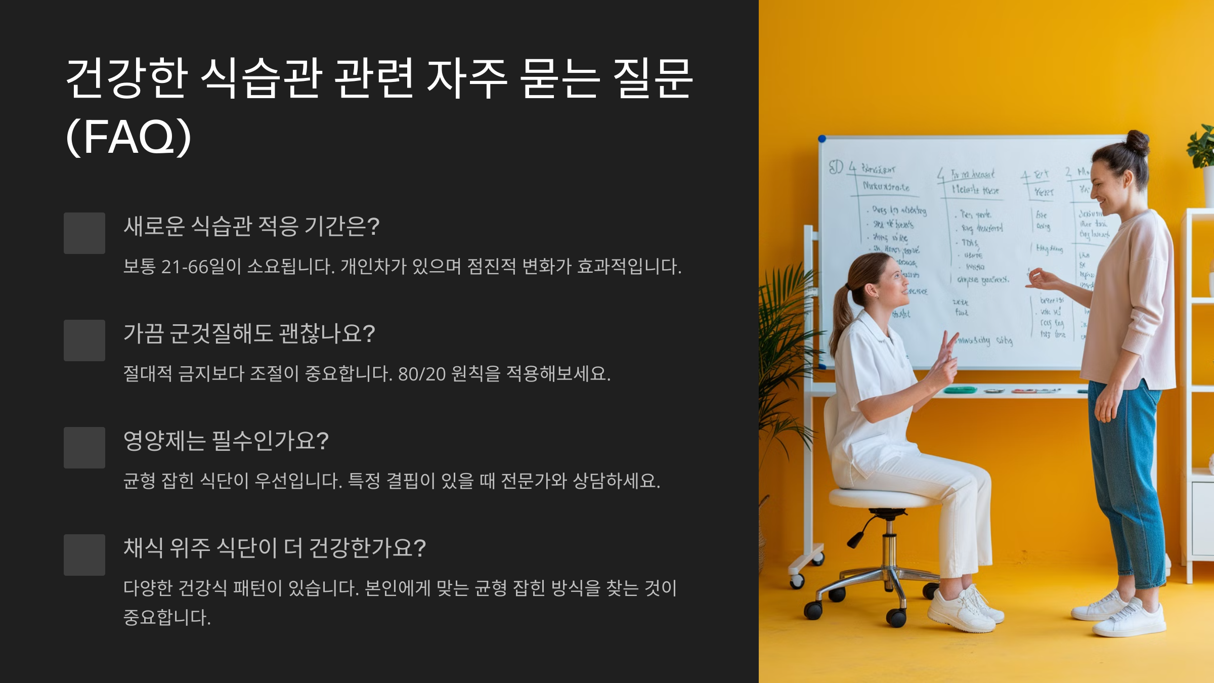 그렇다면 건강한 식습관과 관련된 자주 묻는 질문들을 알아볼까요? 💡