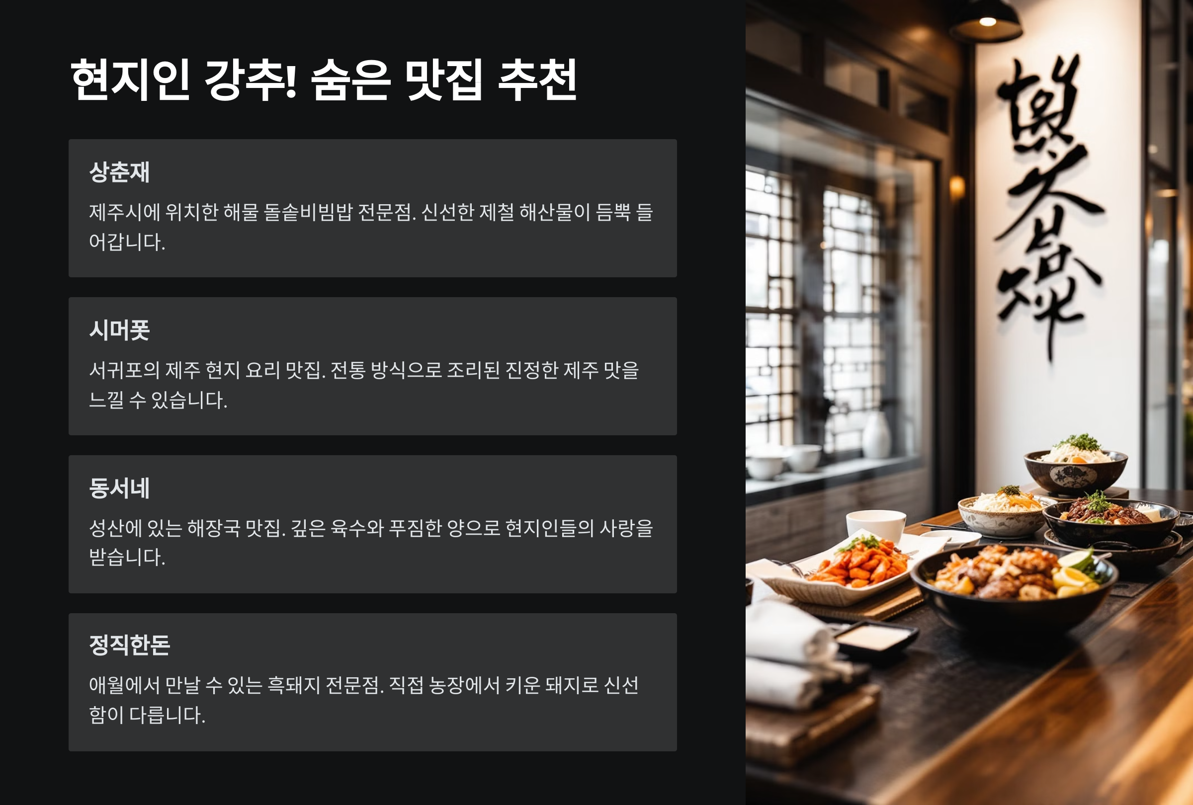 현지인들이 사랑하는 이 맛집들은 관광객들에게 잘 알려지지 않은 곳이라 조용하고 여유롭게 식사를 즐길 수 있어요. 제주도의 숨겨진 맛을 경험하고 싶다면 꼭 들러보세요! 😋