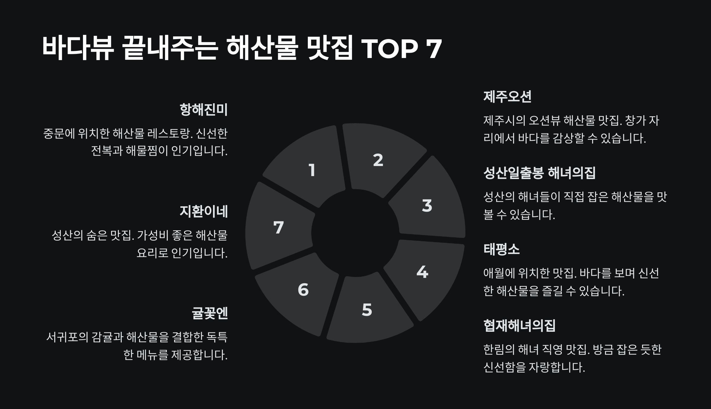 제주도는 사방이 바다로 둘러싸여 있어 신선한 해산물이 가득해요. 특히, 바다를 바라보며 먹는 해산물 요리는 그 맛이 두 배가 되죠! 그래서 바다뷰가 끝내주는 제주 해산물 맛집을 소개할게요. 🌊🐟