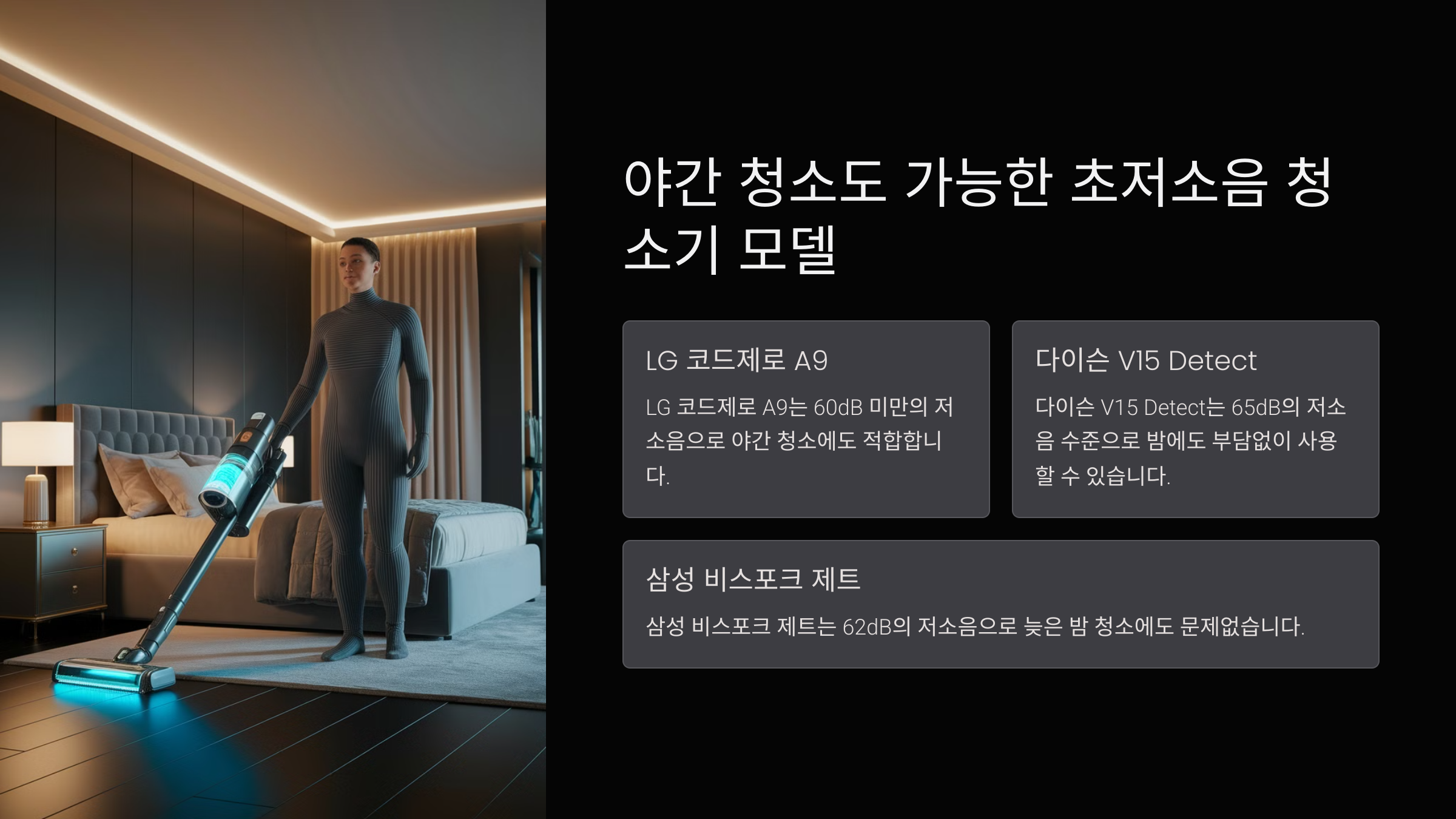 위 제품들은 모두 60dB 이하의 소음으로 야간 청소에도 적합한 제품들이에요. 특히 로봇청소기는 야간 모드 기능이 있어 조용하게 작동하면서도 깨끗하게 청소할 수 있어요.