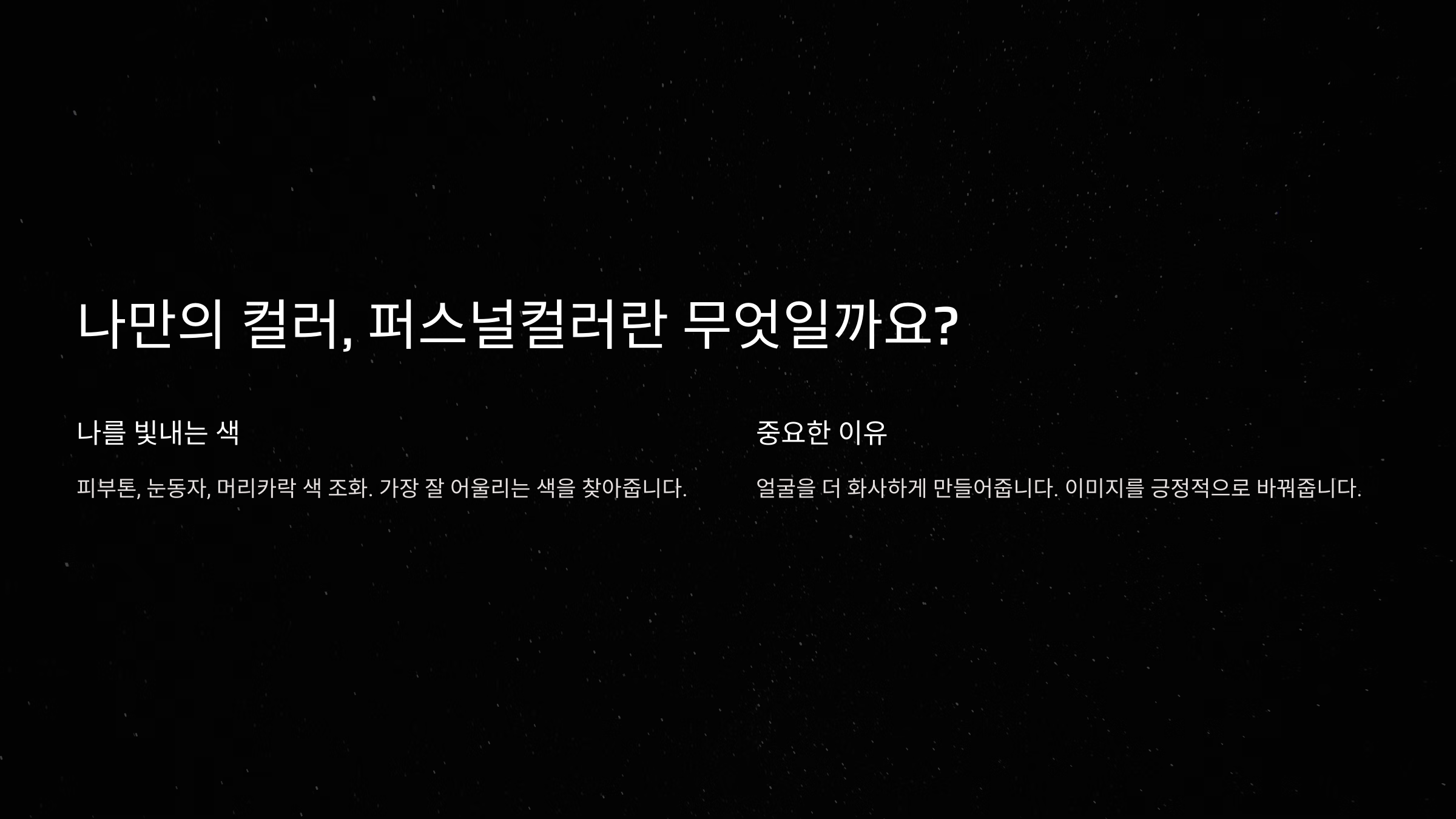 퍼스널컬러란 각자의 피부 톤, 눈동자 색, 머리카락 색 등을 바탕으로 가장 조화를 이루는 색상을 찾는 개념이에요. 이를 통해 피부가 더욱 맑고 생기 있어 보이게 만들 수 있어요.