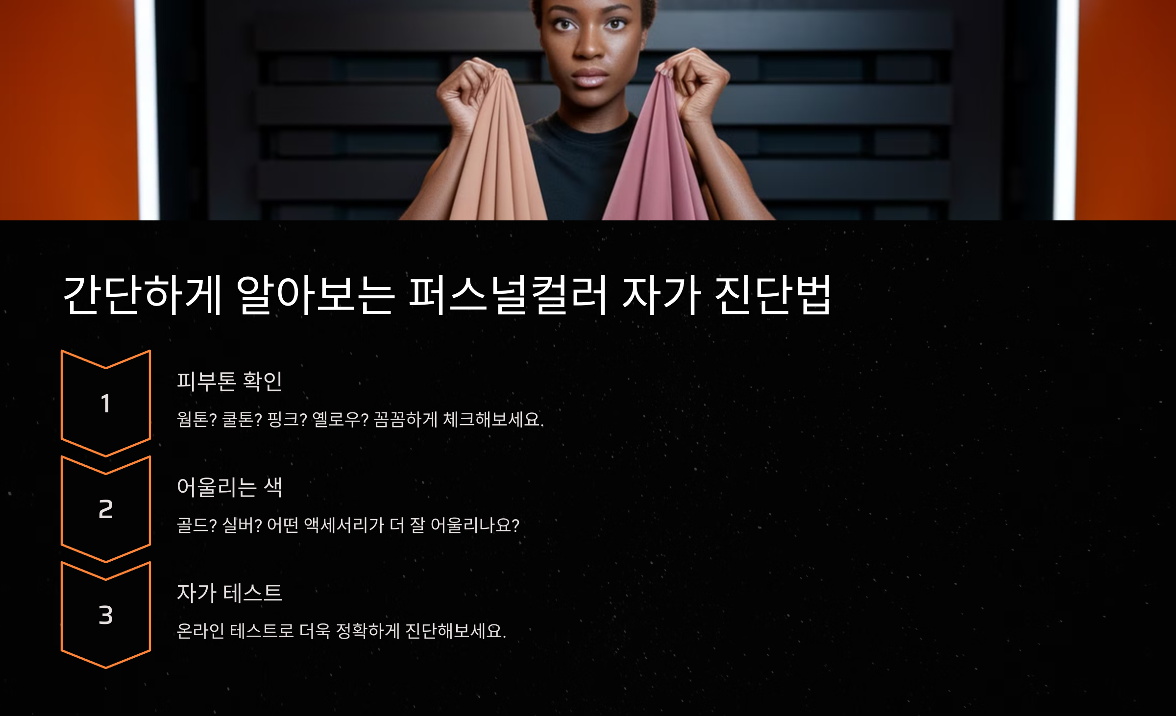 이제 자신의 퍼스널컬러 유형을 알았다면, 직접 테스트해볼 차례예요! 셀프 진단 방법과 전문가 진단 방법을 비교해볼까요? 👀
