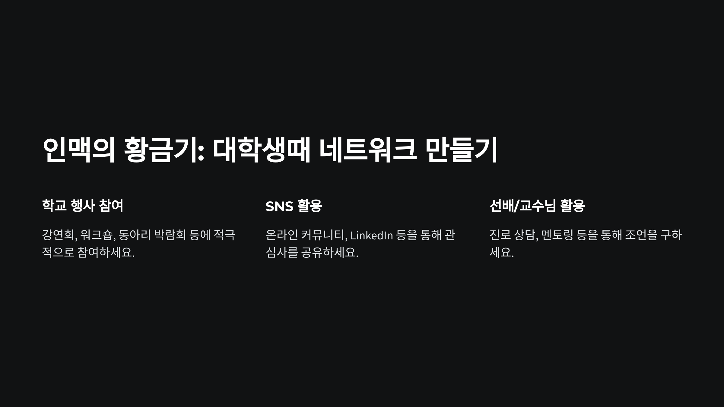 🌱 학교 내 네트워크: 동아리, 학회, 팀 프로젝트에서 적극적으로 참여하면 자연스럽게 인맥이 생겨요. 특히 교수님과 친해지면 추천서나 인턴 기회도 얻을 수 있답니다!