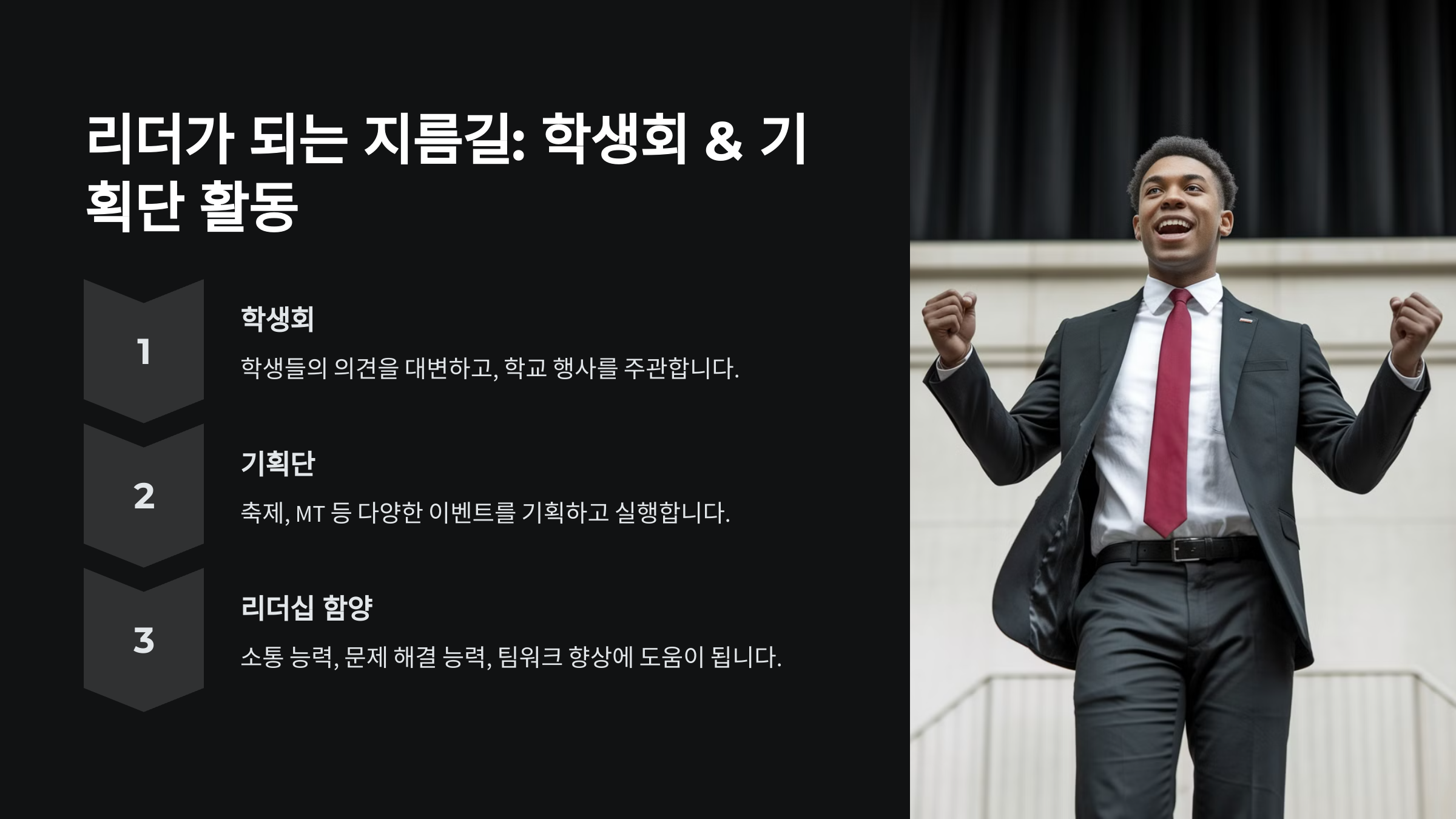 🌟 동아리 운영진 도전: 동아리 회장, 부회장, 기획팀 등 운영진이 되면 조직 운영 능력과 리더십을 기를 수 있어요. 스스로 리더 역할을 맡아 보면 성장하는 경험을 할 수 있답니다!