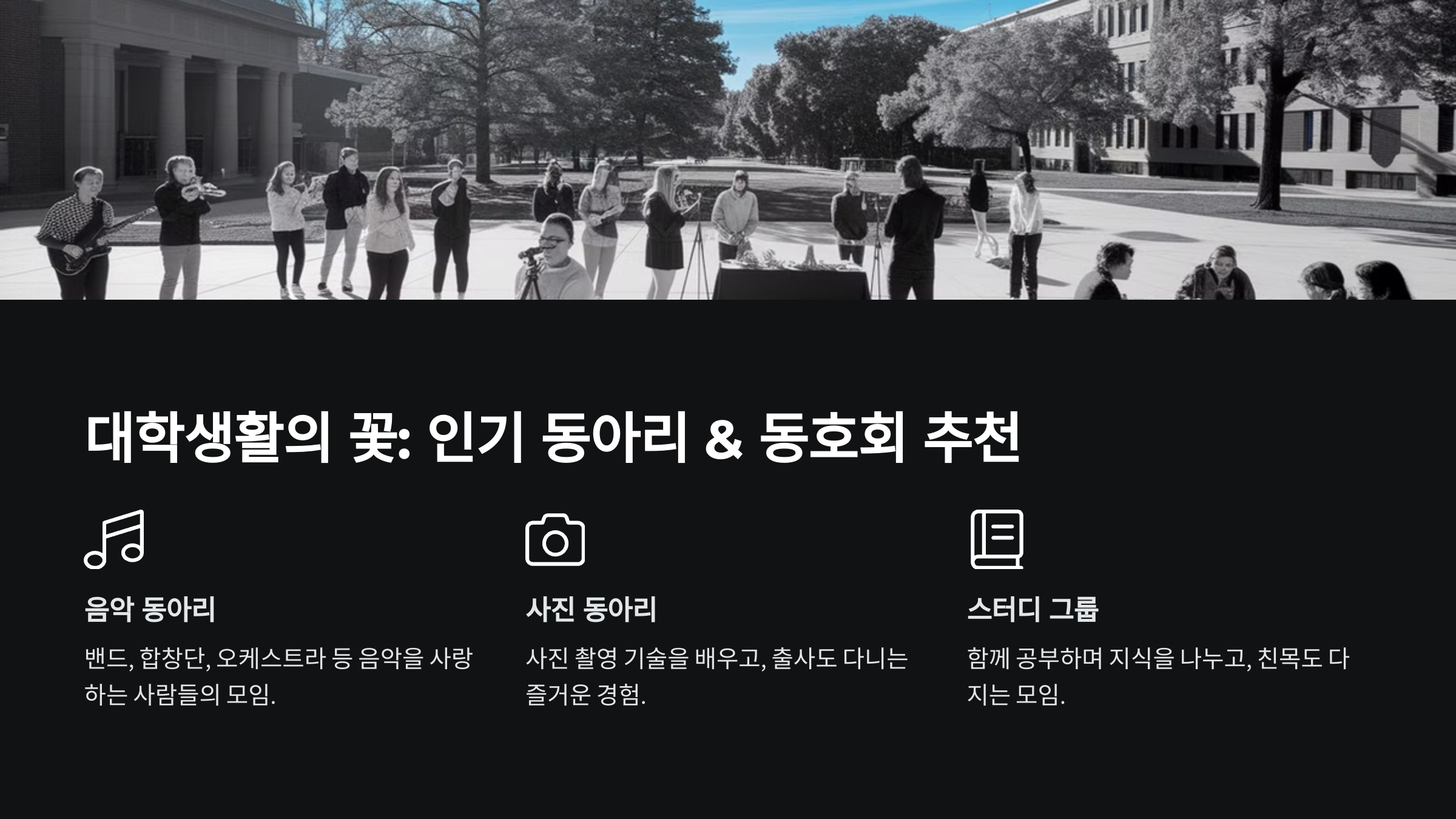 🎨 예술 & 창작 동아리: 사진, 밴드, 연극, 댄스 등 예술적인 감각을 살릴 수 있는 동아리도 인기 많아요. 특히 공연과 전시를 통해 색다른 경험을 할 수 있어요.