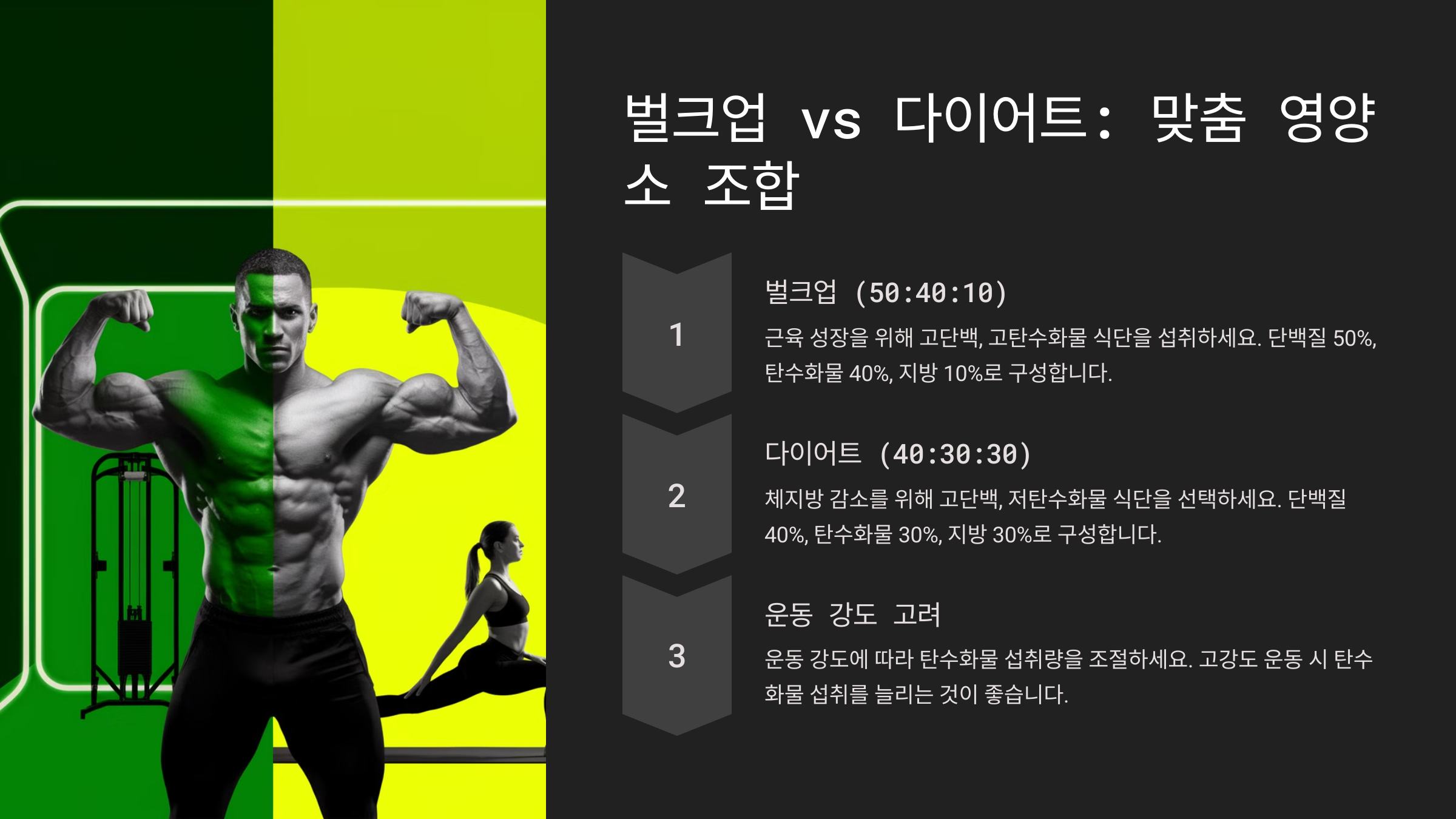 📌 계속해서 벌크업과 다이어트별 영양소 조합을 알아볼게요!