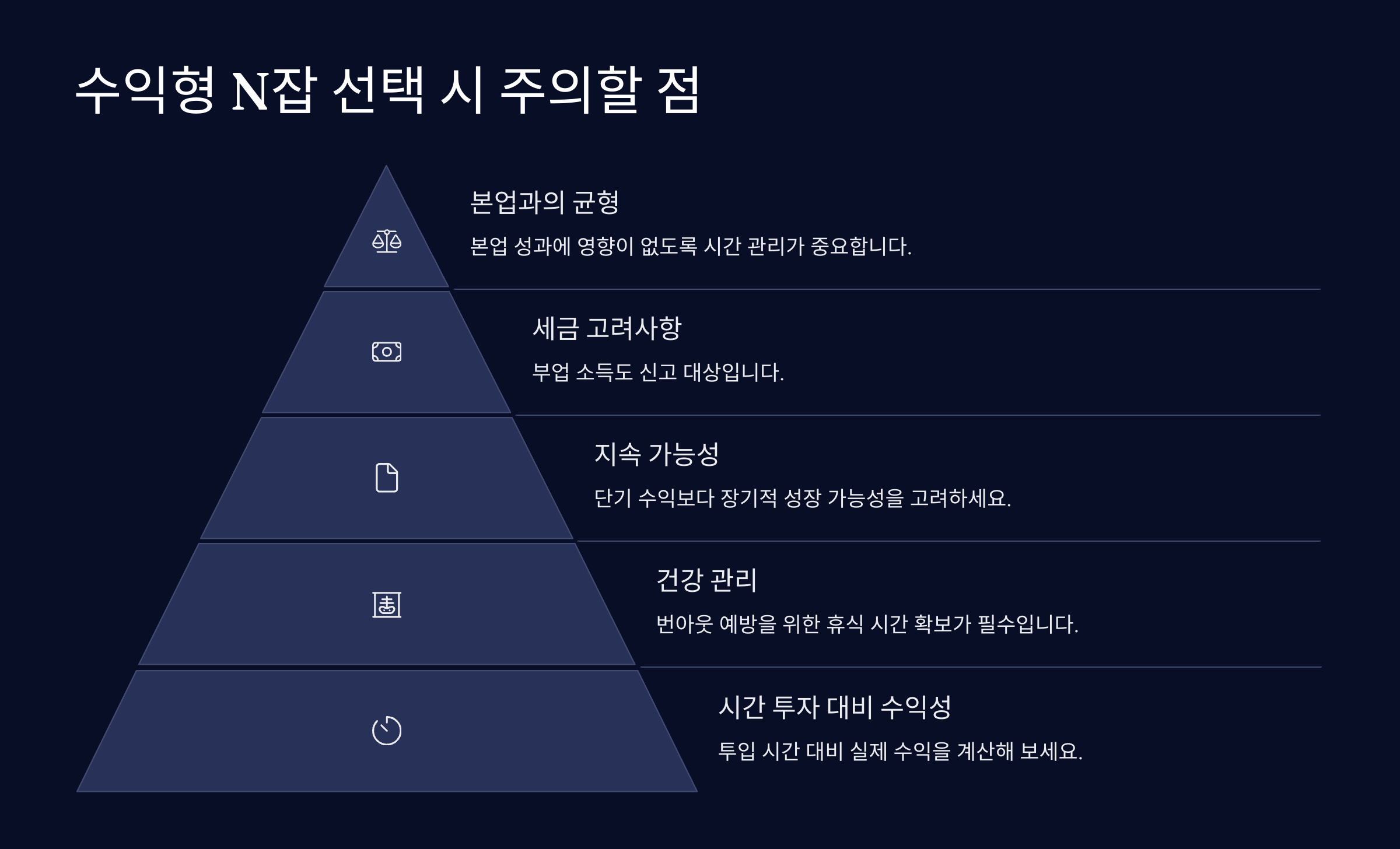 N잡을 시작할 때는 무조건 돈이 된다고 해서 덥석 시작하면 안 돼요! 자신에게 맞는 방법을 선택하고, 리스크를 최소화하는 것이 중요해요. 🧐