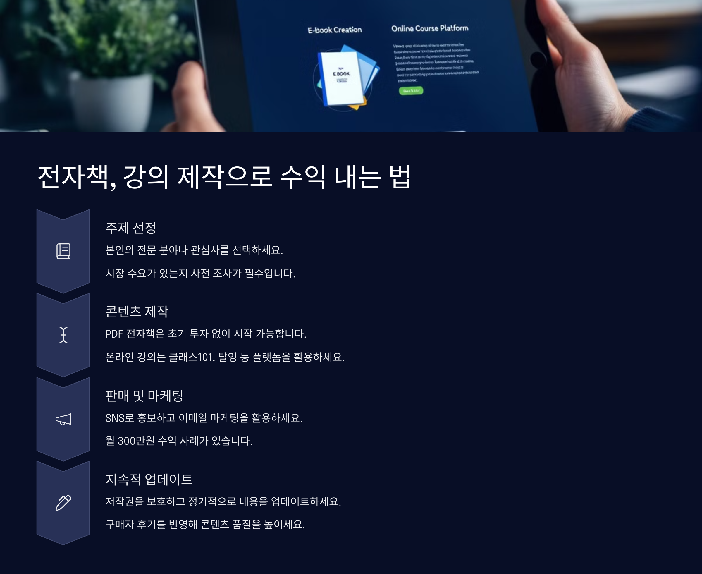 전자책과 온라인 강의는 지식과 경험을 활용해 수익을 창출하는 좋은 방법이에요. 한 번 만들어 놓으면 꾸준히 판매되면서 패시브 인컴(수동적 수익)을 얻을 수 있어요. 💰