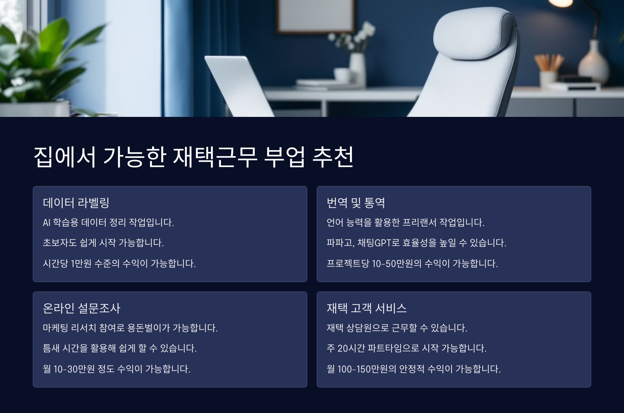 재택근무 부업은 집에서 편하게 할 수 있다는 장점이 있어요. 하지만 본인의 스킬과 성향에 맞는 부업을 선택하는 것이 중요해요! 🏡