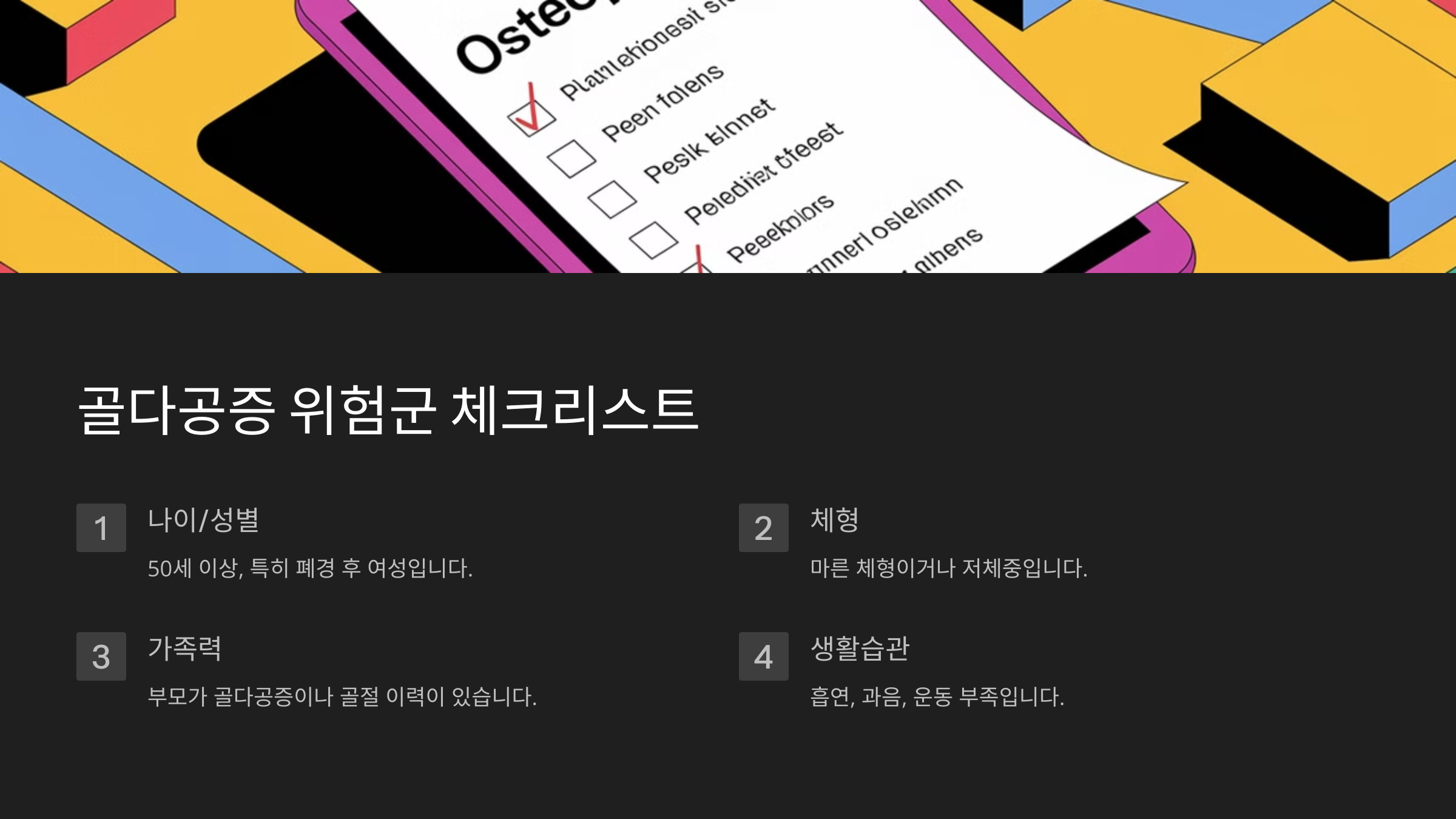 골다공증은 조용히 진행되는 병이라 초기에 알아차리기 어려워요. 하지만 몇 가지 위험 요소를 체크하면 자신의 뼈 건강 상태를 예측할 수 있어요. 아래 체크리스트를 확인하고 해당하는 항목이 많다면 골밀도 검사를 고려해 보세요!