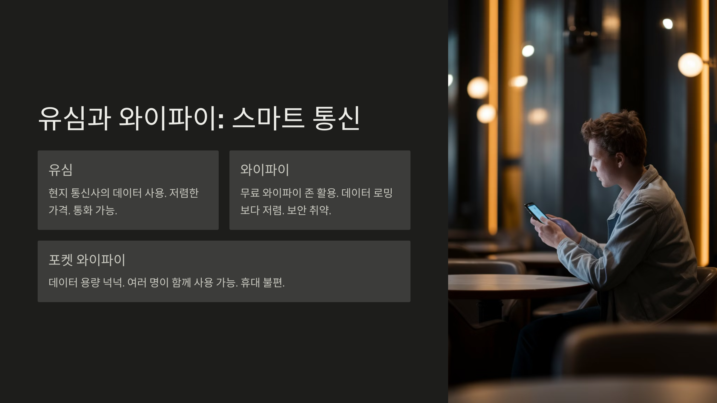 유럽 자유여행을 하려면 **데이터 사용**이 필수예요. 구글 맵으로 길 찾기, 맛집 검색, 번역기 사용 등 인터넷이 없으면 불편한 순간이 많아요. 유럽에서 인터넷을 사용하는 방법으로는 **로밍, 현지 유심, eSIM, 포켓 와이파이** 등이 있어요.
