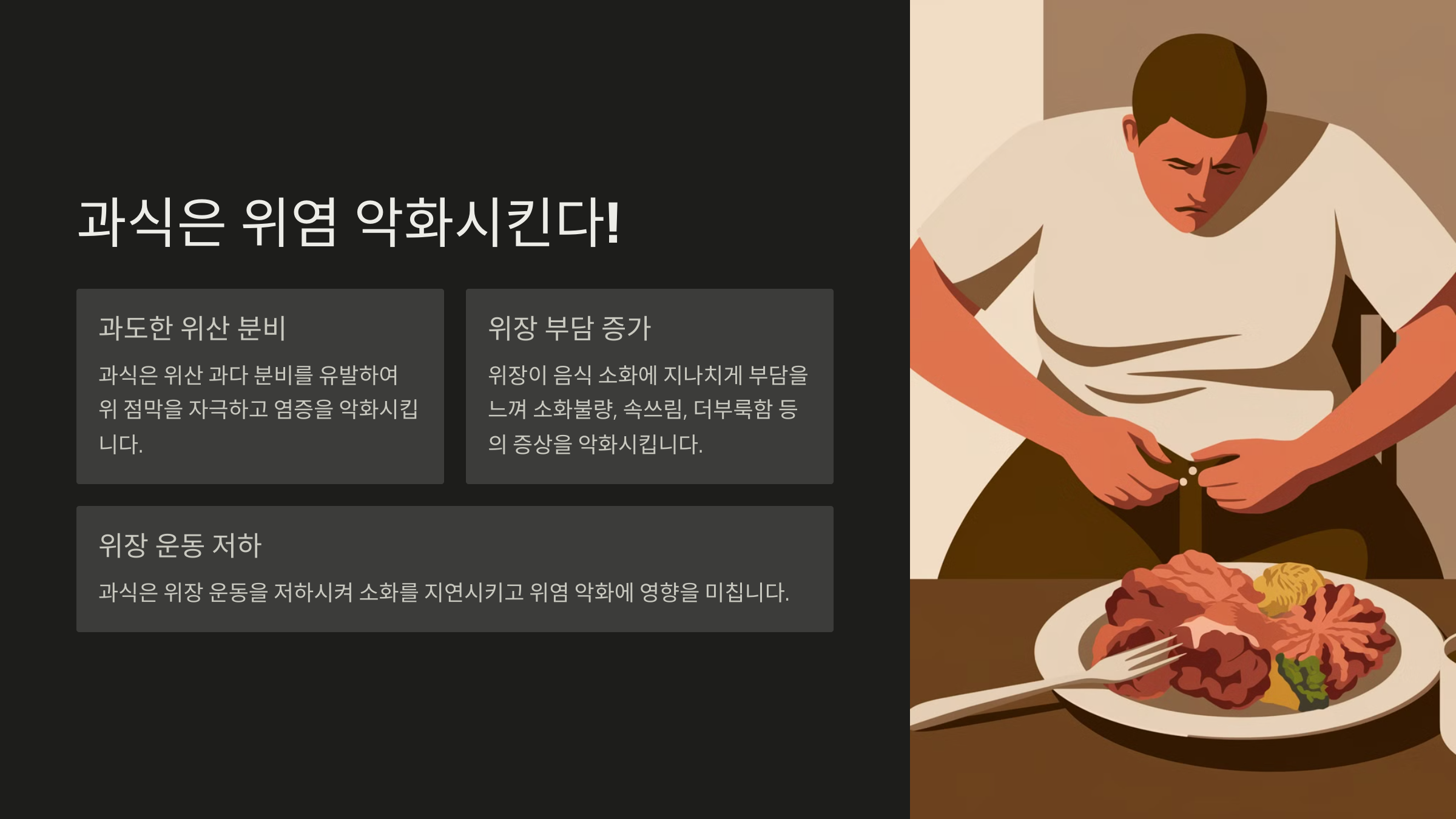 과식은 위염을 악화시키는 대표적인 원인 중 하나예요. 한 번에 많은 양의 음식을 먹으면 위에 과도한 부담이 가해지고, 위산 분비가 증가해 위 점막을 자극하게 돼요.