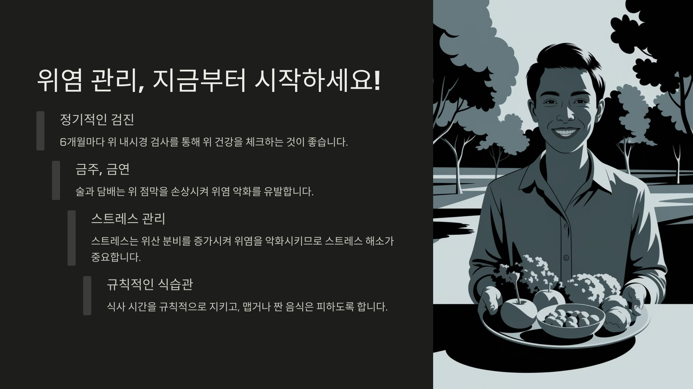 위염을 예방하고 관리하려면 올바른 식습관과 생활습관을 유지하는 것이 가장 중요해요. 정기적인 위 검진을 받으며 건강한 위장을 지켜보세요! 😊