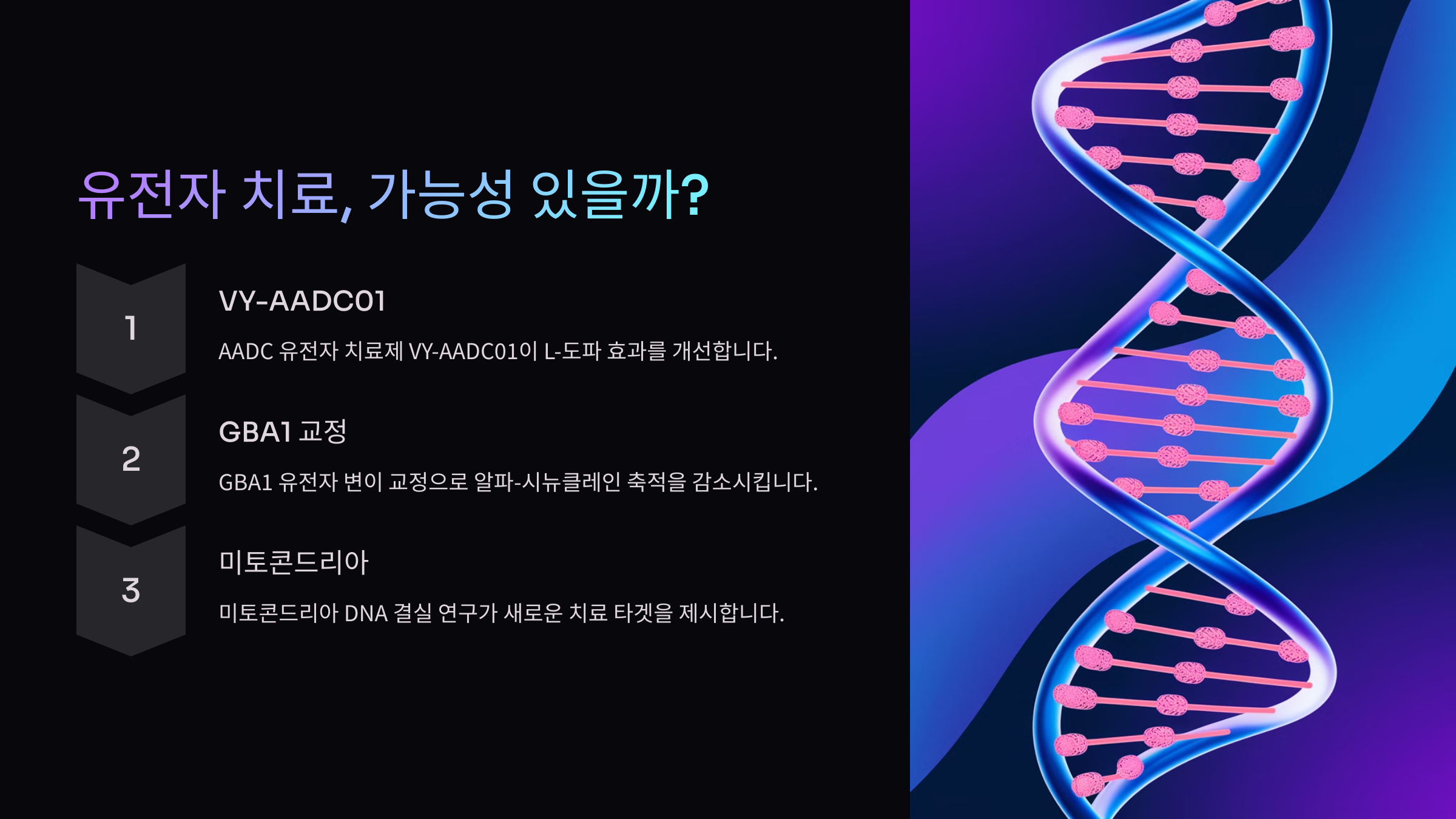 유전자 치료는 파킨슨병 치료에서 가장 혁신적인 접근 방식 중 하나로 떠오르고 있어요. 이 치료법은 특정 유전자를 조작하여 신경세포가 도파민을 더 잘 생성하거나 손상된 신경을 보호하는 데 도움을 줄 수 있어요.